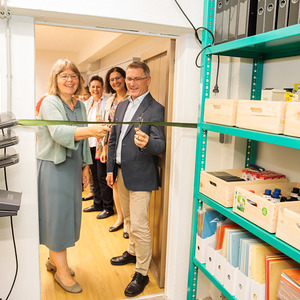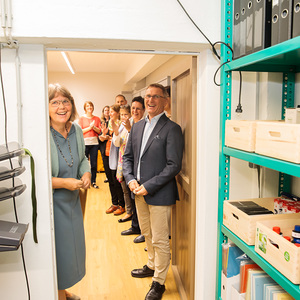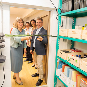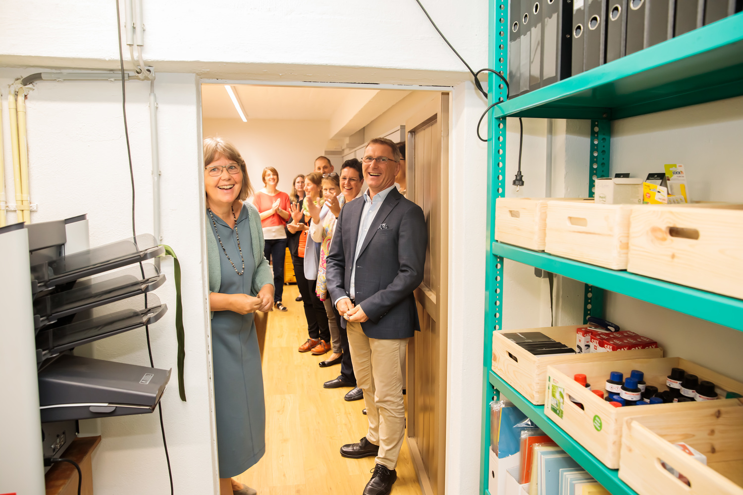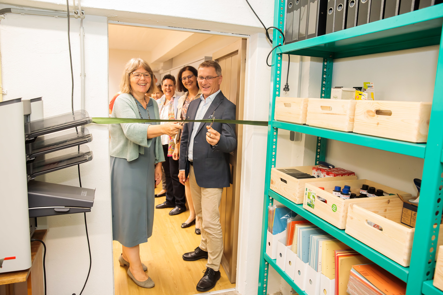 Umweltbeauftragte Hemma Opis-Pieber dankte dem „Team Pro Schöpfung“, das lange an der Umsetzung getüftelt hatte. Eine kleine Gruppe von vier Kolleginnen wird sich in Zukunft um den reibungslosen Ablauf kümmern. Wirtschaftsdirektor Andreas Ehart bezeichnete die Materialstelle als „kleinen Puzzlestein zur Rettung der Welt“ und unterstützt das Anliegen mit der großzügigen Übernahme der Kosten. Gemeinsam wurde dann ein „grünes Band“ durchgeschnitten und die Materialstelle ihrer Bestimmung übergeben. Schon im sommerlichen Probelauf war das Interesse und die Freude der Kolleg:innen groß.