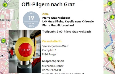 Am 19.3.2025 sammelt sich die Pilgergruppe bei der Pfarre Graz-Kroisbach. Gemeinsam geht es anschließend weiter in die Kirche und Kapelle (neue Chirurgie) im Landeskrankenhaus Graz sowie in die Pfarre St. Leonhard.