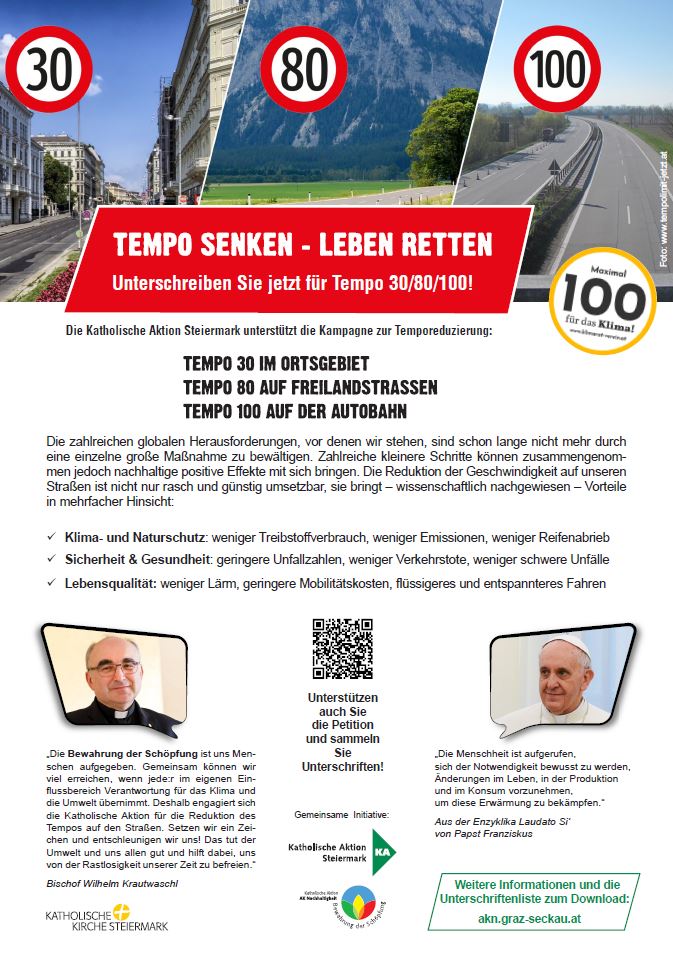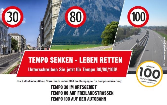 „Die Bewahrung der Schöpfung ist uns Menschen aufgegeben. Gemeinsam können wir viel erreichen, wenn jede:r im eigenen Einflussbereich Verantwortung für das Klima und die Umwelt übernimmt. Deshalb engagiert sich die Katholische Aktion für die Reduktion des Tempos auf den Straßen. Setzen wir ein Zeichen und entschleunigen wir uns! Das tut der Umwelt und uns allen gut und hilft dabei, uns von der Rastlosigkeit unserer Zeit zu befreien.“