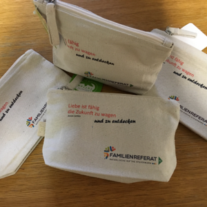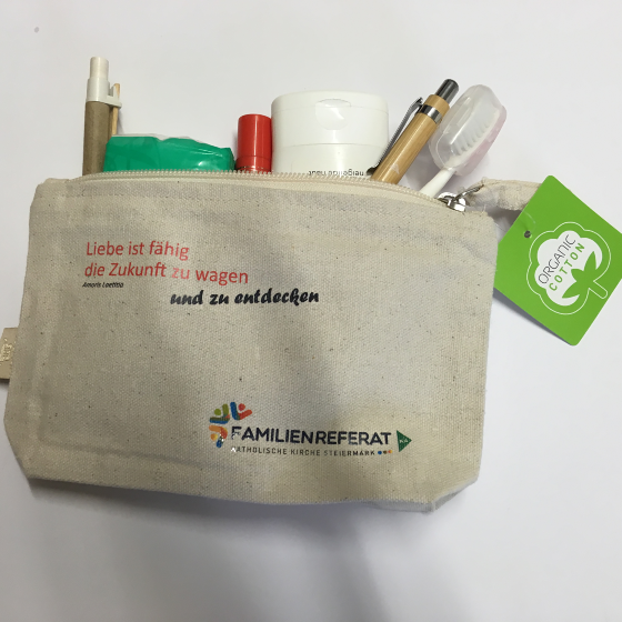 Die handliche Kulturtasche (Glumpert-Sackerl, Krimskrams-Beutel, …) mit dem Familienreferatslogo ist eine praktische Aufbewahrungsmöglichkeit diverser Utensilien für Handtasche, Rucksack, Handgepäck, Reisekoffer, …
