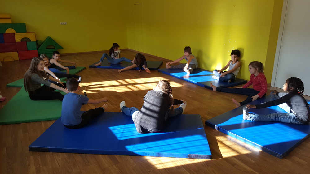 Gesundes Leben umfasst aber nicht nur das Essen und Bewegung, sondern auch das richtige Maß zwischen Anstrengung und Erholung und die psychische Gesundheit. Gerade Schulkinder leiden oft unter Stress und zu viel Druck von ihrer Umgebung. Hier versuchen wir ausgleichend zu wirken und den Kindern Entspannungsphasen und Entspannungstechniken zu zeigen.