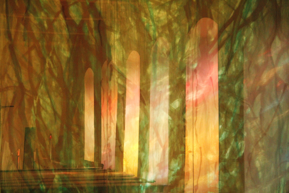 Das glühende Grün vom Bildhintergrund des Kreuzbildes wird fortgeführt in den ostseitigen Glasfenstern Michael Kienzers. Seine Glasskulpturen-Fenster erzählen nichts, stemmen sich gegen die hektische Bilderfülle unseres Medienzeitalters. In mehrere Schichten aus Glas hat Kienzer seine malerischen Gesten eingetragen, in Kommunikation untereinander, aber auch durchlässig für den Aussenraum, der mit lebensvollem Grün am Morgen prägend in den Innenraum tritt. Die Glaswand des Eingangsbereichs setzt den Dialog fort; Kapellenraum und Foyer werden zu spannender Zwiesprache geführt: Der Ort des Gebets und kontemplativer Ruhe existiert nicht abgehoben von unserer Lebenswelt, er wirkt hinaus und unser Alltag in ihn hinein.