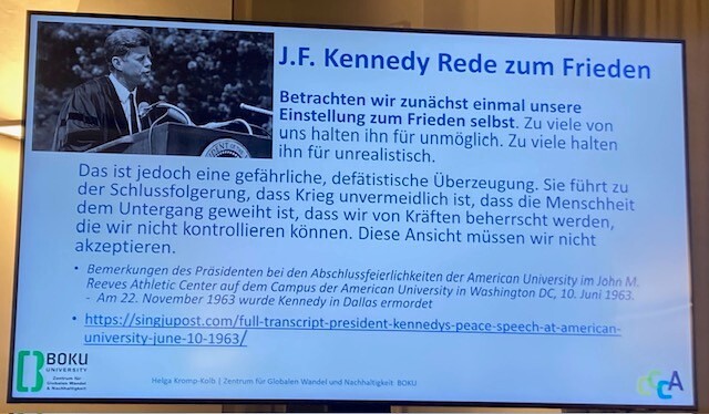 Entscheidend sei, dass diese Transformation sowohl die wechselseitige Beeinflussung von Nachhaltigkeit und Frieden als auch ein neues Verständnis von Lebensqualität, nicht als käufliches Konsumgut, sondern als innere Zufriedenheit, mit berücksichtige. Um diese innere Zufriedenheit zu erlangen, sei es u.a. wesentlich, „nicht unbedingt dazugehören zu müssen“ und auch den „persönlichen Handabdruck dadurch zu stärken, dass ich andere Menschen in ihrem Tun unterstütze,Leserbriefe zur Durchsetzung von Klimaschutzmaßnahmen schreibe oder mich bei NGOs engagiere“, so Kromp-Kolb. Ziel müsse es sein, „das Notwendige möglich zu machen!“