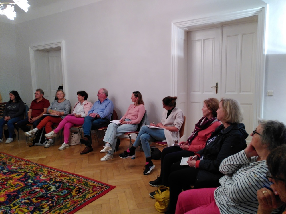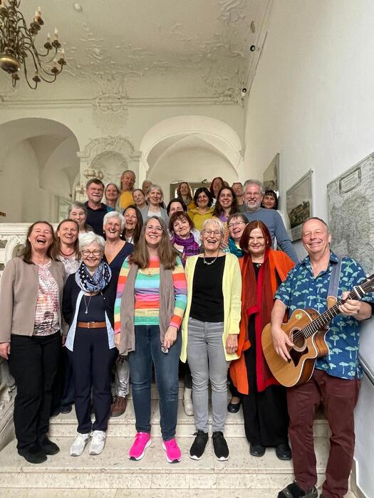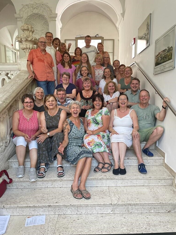 31 bereits erfahrene, begeisterte Teilnehmer:innen aus Österreich, Deutschland und der Schweiz erarbeiteten vom 13. bis 16. Juli im Schloss Retzhof in der Südsteiermark ein umfangreiches, methodisch-didaktisch neu aufbereitetes Repertoire kraftvoller Chants und heilsamer Lieder sowie zahlreiche choreografische Handlungsanleitungen für die persönliche Arbeit mit unterschiedlichen Singgruppen. Schwerpunkt der Intensiv-Weiterbildung lag zudem auf dem Schaffen neuer Resonanzräume auf der Basis von Angenommensein und Gemeinschaft, Zuwendung und Begeisterungsfähigkeit.