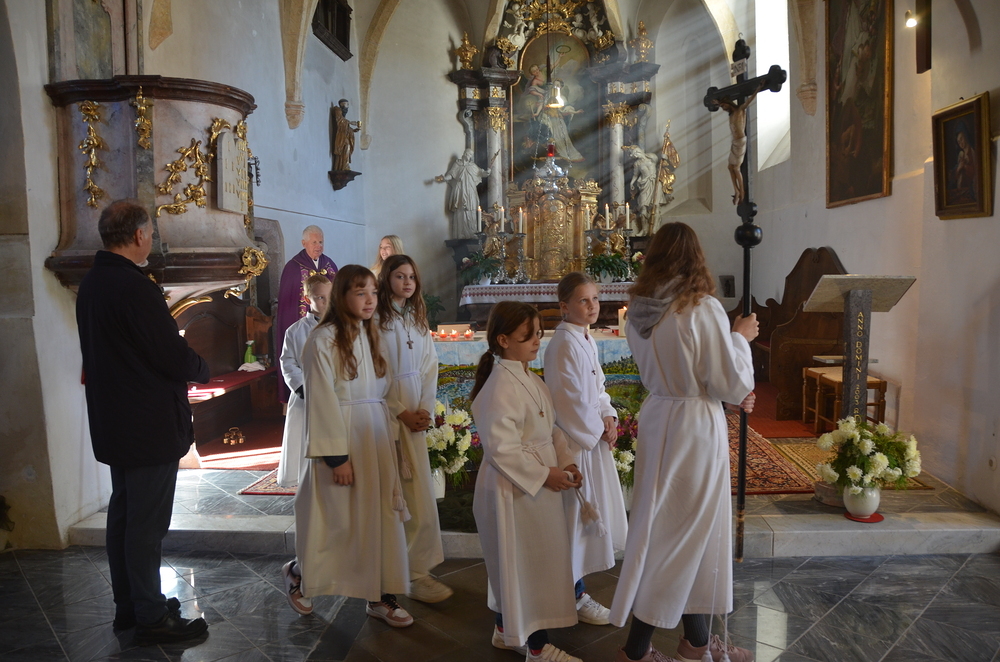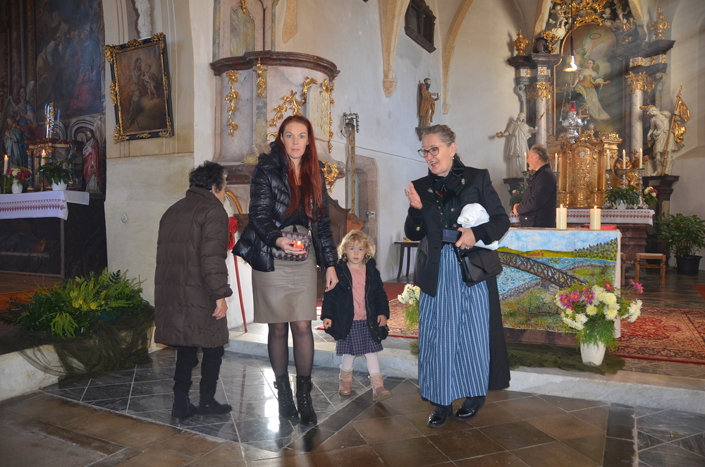 Nach der Predigt wurden die Heiligen, die in der Peggauer Kirche dargestellt sind, angerufen, wobei die Ministranten auf die Heiligenfiguren zeigten.
