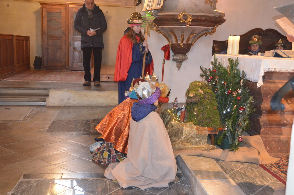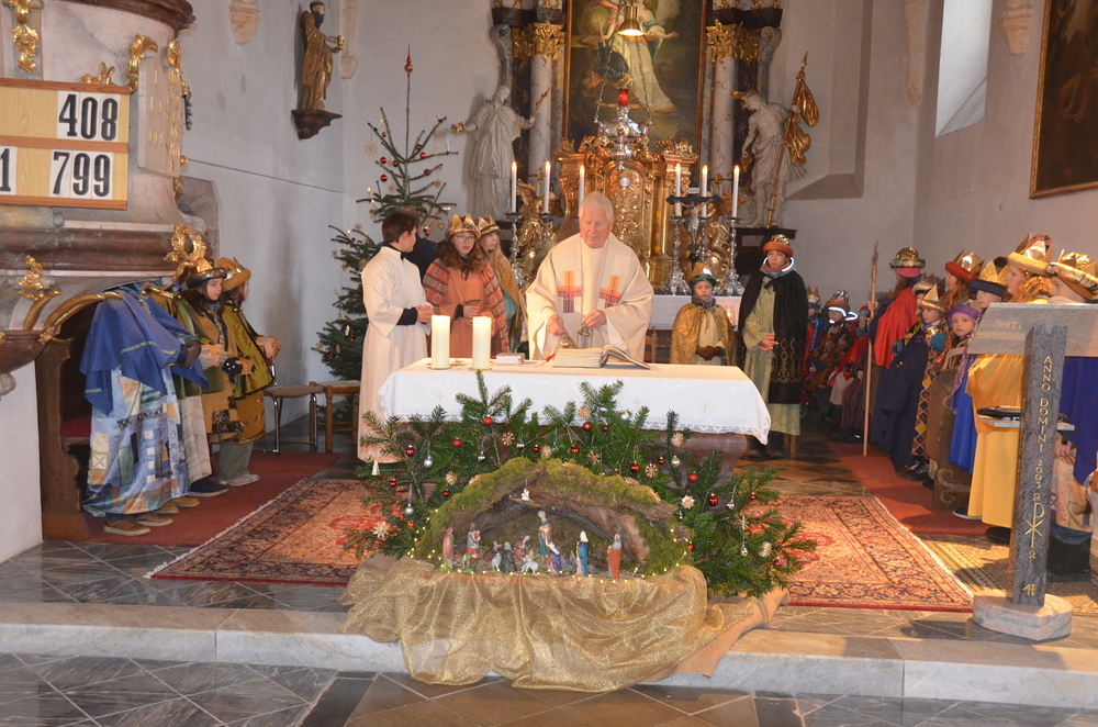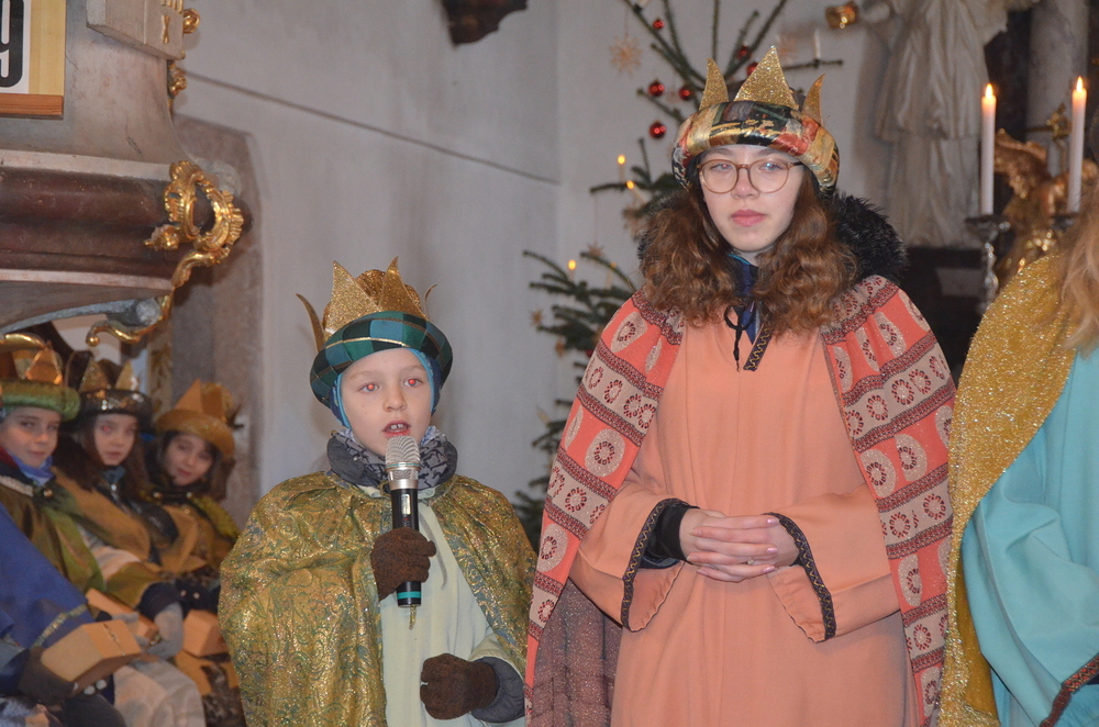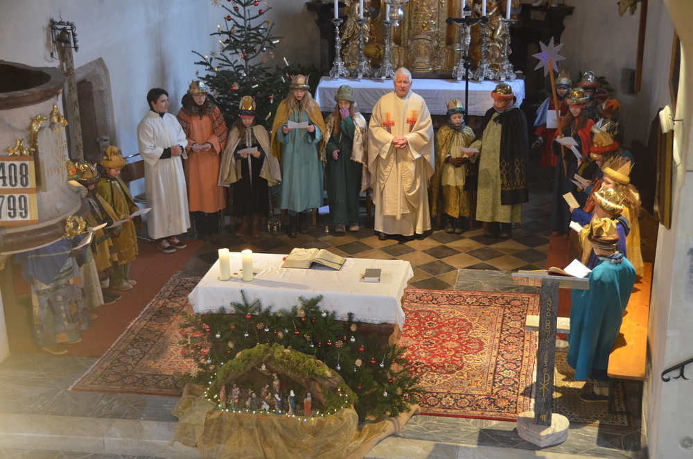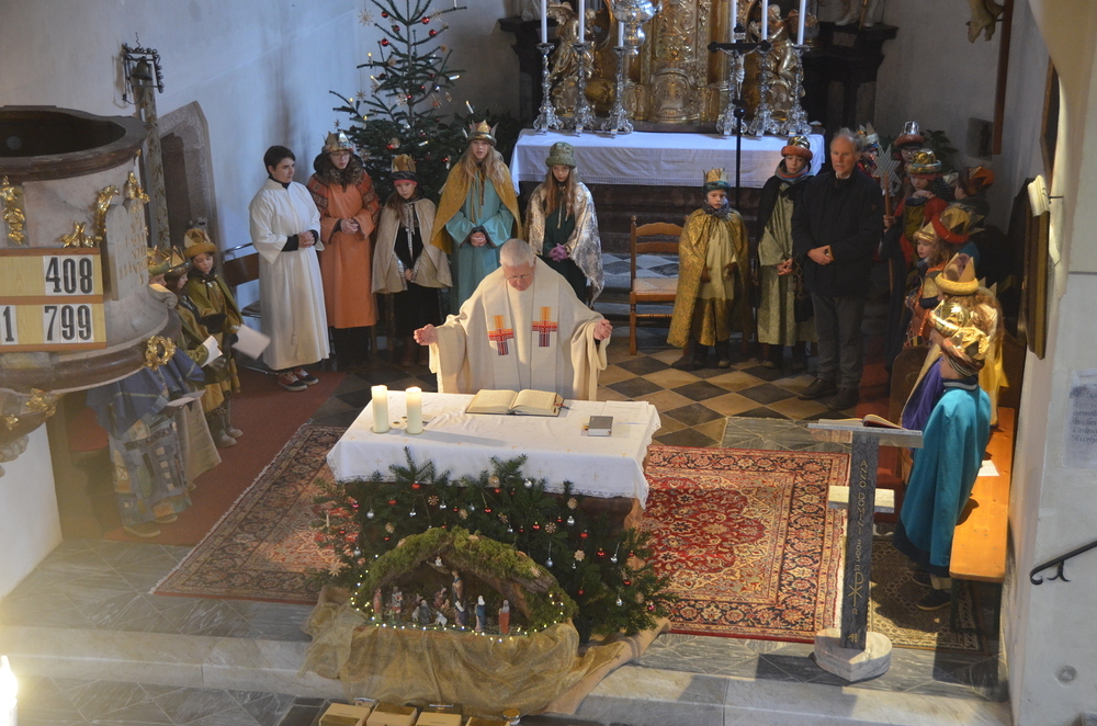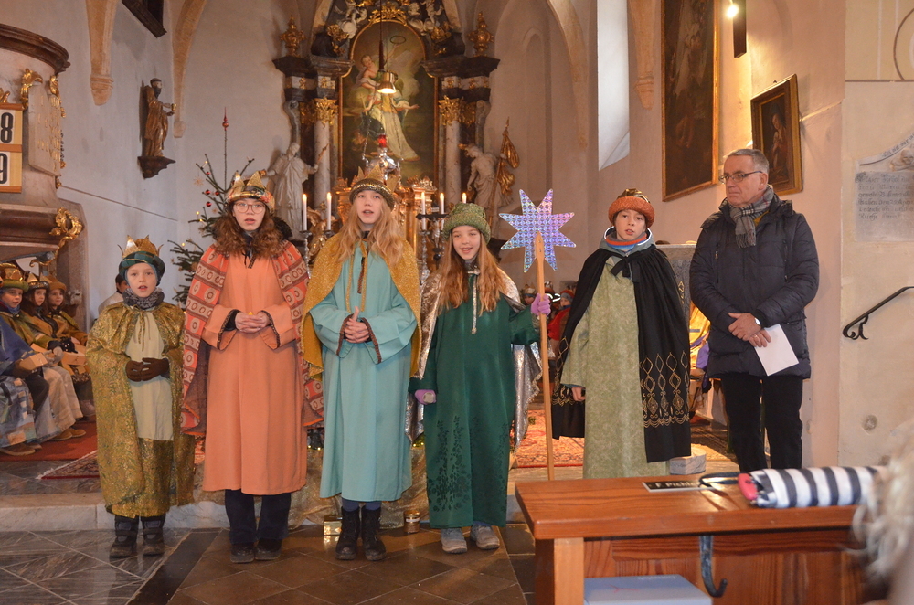 Nach dem Evangelienspiel unter der bewährten Regie von Toni Gschier erzählte Pfarrer Schlacher die Geschichte des Goldes, das die Könige dem Kind in der Krippe darbringen. Es weist auf die Göttlichkeit von Jesus hin, der uns als Kind begegnet und so den Menschen zum Segen wird. Diesen Segen tragen die Sternsinger in die Häuser und auf die Plätze unserer Orte. Sie tragen auch dazu bei, dass das gesammelte Geld zum Segen für Familien in Guatemala und vielen anderen Ländern wird, in denen es Projekte der Dreikönigaktion gibt. Ein großes Vergelt’s Gott allen, die auch heuer wieder zum Gelingen des Sternsingens beigetragen haben und den schönen Betrag von € 10.085,49 ermöglicht haben. Möge uns der Segen Gottes in ein gutes neues Jahr 2024 begleiten.