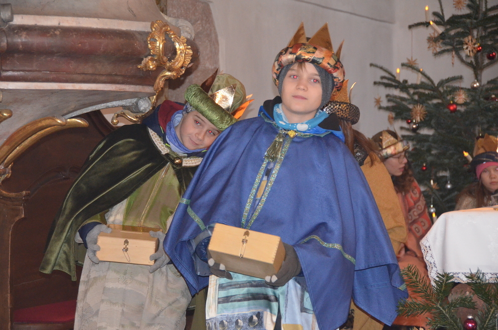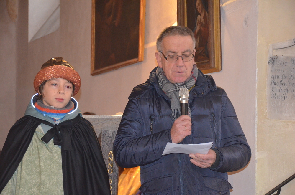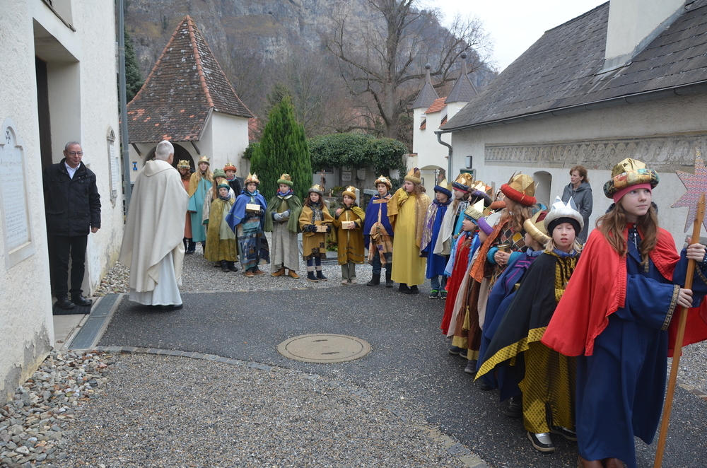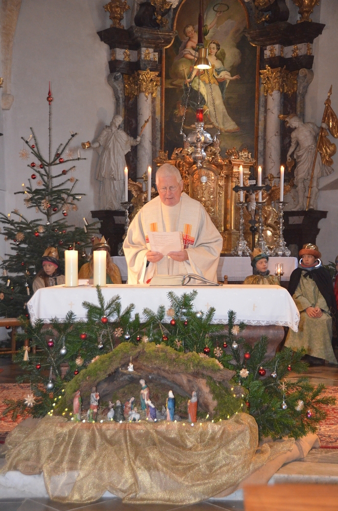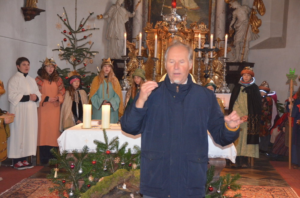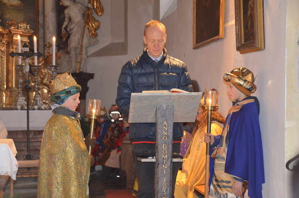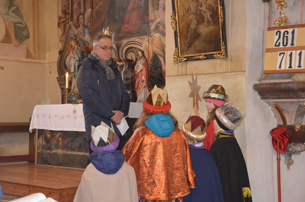 Nach dem Evangelienspiel unter der bewährten Regie von Toni Gschier erzählte Pfarrer Schlacher die Geschichte des Goldes, das die Könige dem Kind in der Krippe darbringen. Es weist auf die Göttlichkeit von Jesus hin, der uns als Kind begegnet und so den Menschen zum Segen wird. Diesen Segen tragen die Sternsinger in die Häuser und auf die Plätze unserer Orte. Sie tragen auch dazu bei, dass das gesammelte Geld zum Segen für Familien in Guatemala und vielen anderen Ländern wird, in denen es Projekte der Dreikönigaktion gibt. Ein großes Vergelt’s Gott allen, die auch heuer wieder zum Gelingen des Sternsingens beigetragen haben und den schönen Betrag von € 10.085,49 ermöglicht haben. Möge uns der Segen Gottes in ein gutes neues Jahr 2024 begleiten.