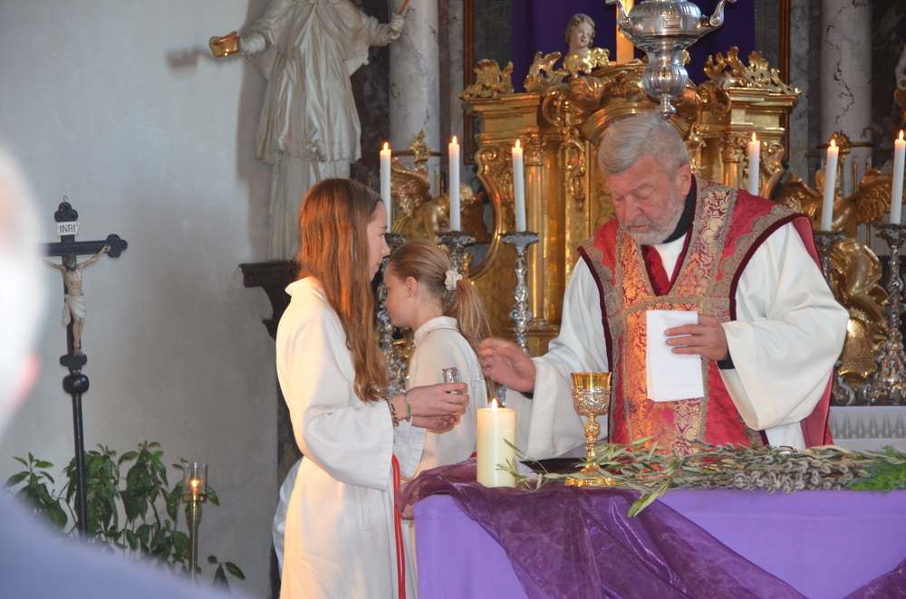 Pfarrer Dr. Hüttl segnete die mitgebrachten Palmzweige, bestehend aus Weidenkätzchen, und hatte auch einige echte Ölzweige dabei. Die freiwilligen Spenden dafür kommen Christinnen und Christen in Palästina zugute, die aktuell unter schweren, unmenschlichen Bedingungen leben müssen.