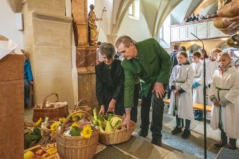 Die Kinder des Pfarrkindergartens zogen feierlich mit einer kleinen Erntekrone in die Kirche ein. Schon Wochen vorher übten sie verschiedene Lieder ein, die sie mit Begeisterung aus voller Kehle sangen. Vertreter der Bauernschaft legten Erntegaben vor dem Altar nieder und für die Bauern berichtete Frau Köppel von den Witterungsbedingungen des abgelaufenen landwirtschaftlichen Jahres, die eine gute Ernte ermöglichten. Sie wies aber auch auf die vielfachen anderen Bereiche unseres Lebens hin, für die wir dankbar sein müssen.