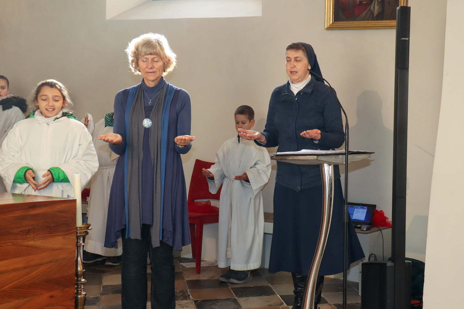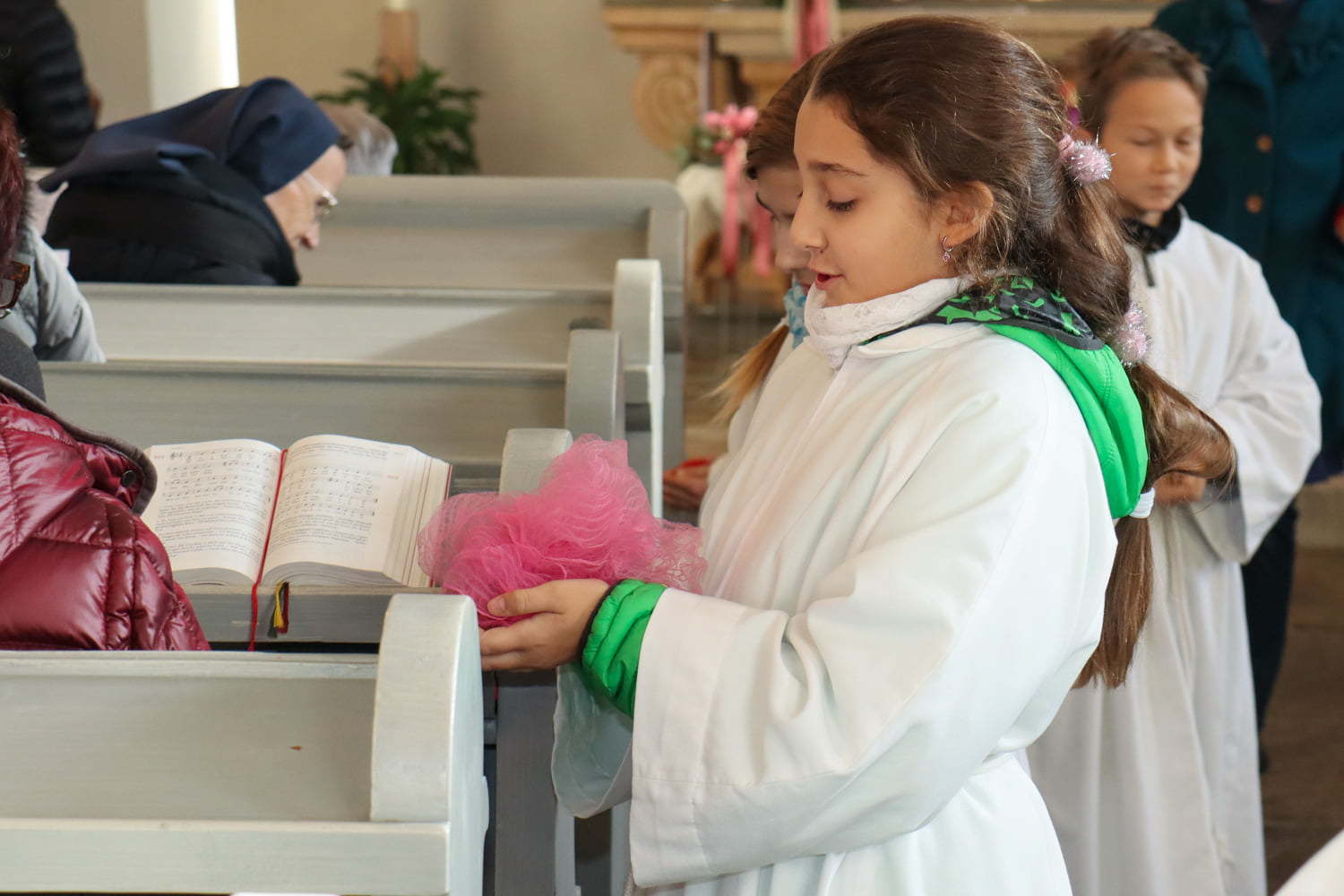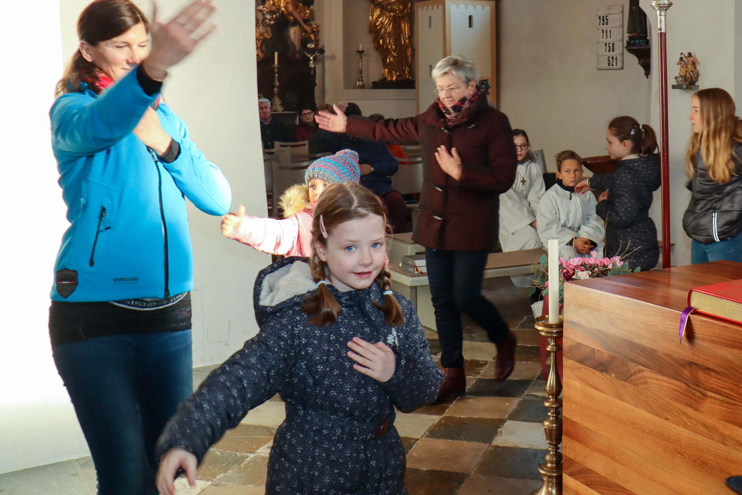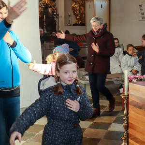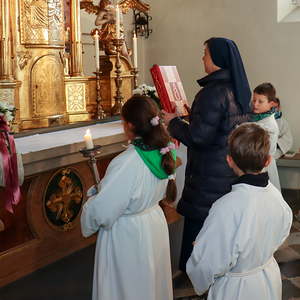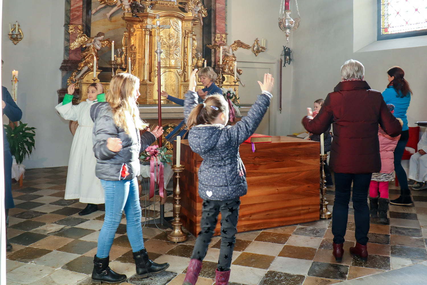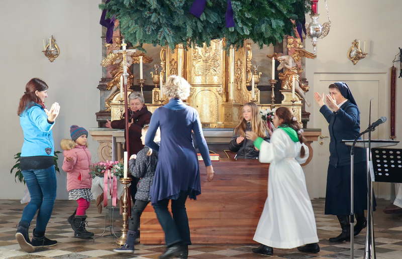 In der Wortgottesfeier ist mehr Raum für neue Elemente. So tanzte Barbara Koren mit einigen Frauen und Kindern den Tanz „Samen der Liebe“. Gebet ist nicht nur reden, singen, still sein … sondern auch mit Leib und Seele, mit dem ganzen Körper meinen Glauben zum Ausdruck zu bringen. Vor dem Segen zeigten die Kinder mit einer symbolischen Handlung – das Aufblühen „einer Blüte“ mit Seidentüchern – was es bedeutet, füreinander zum Segen zu werden.