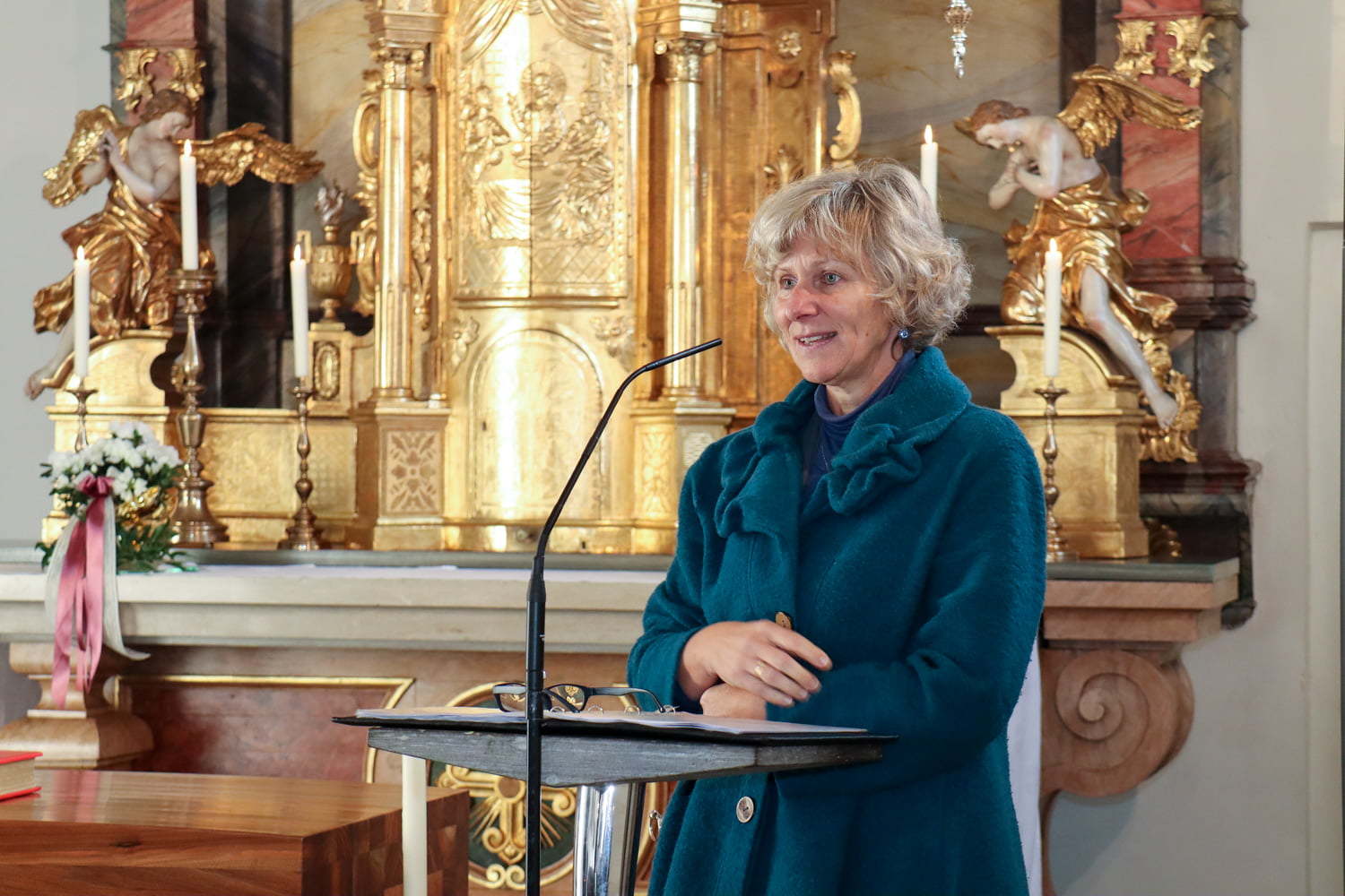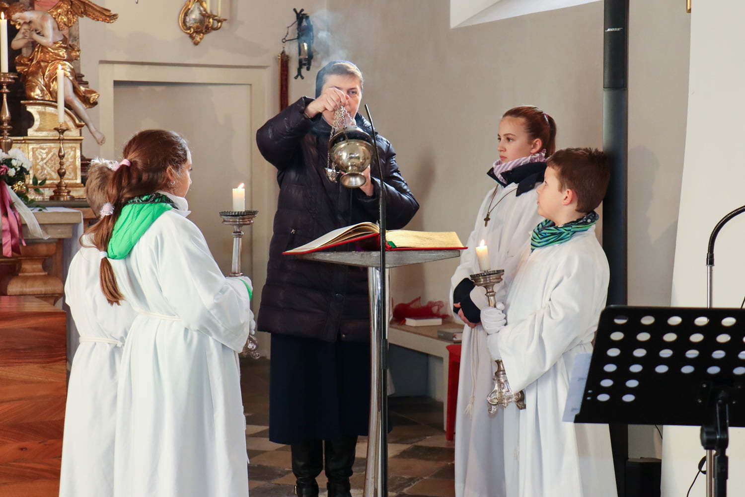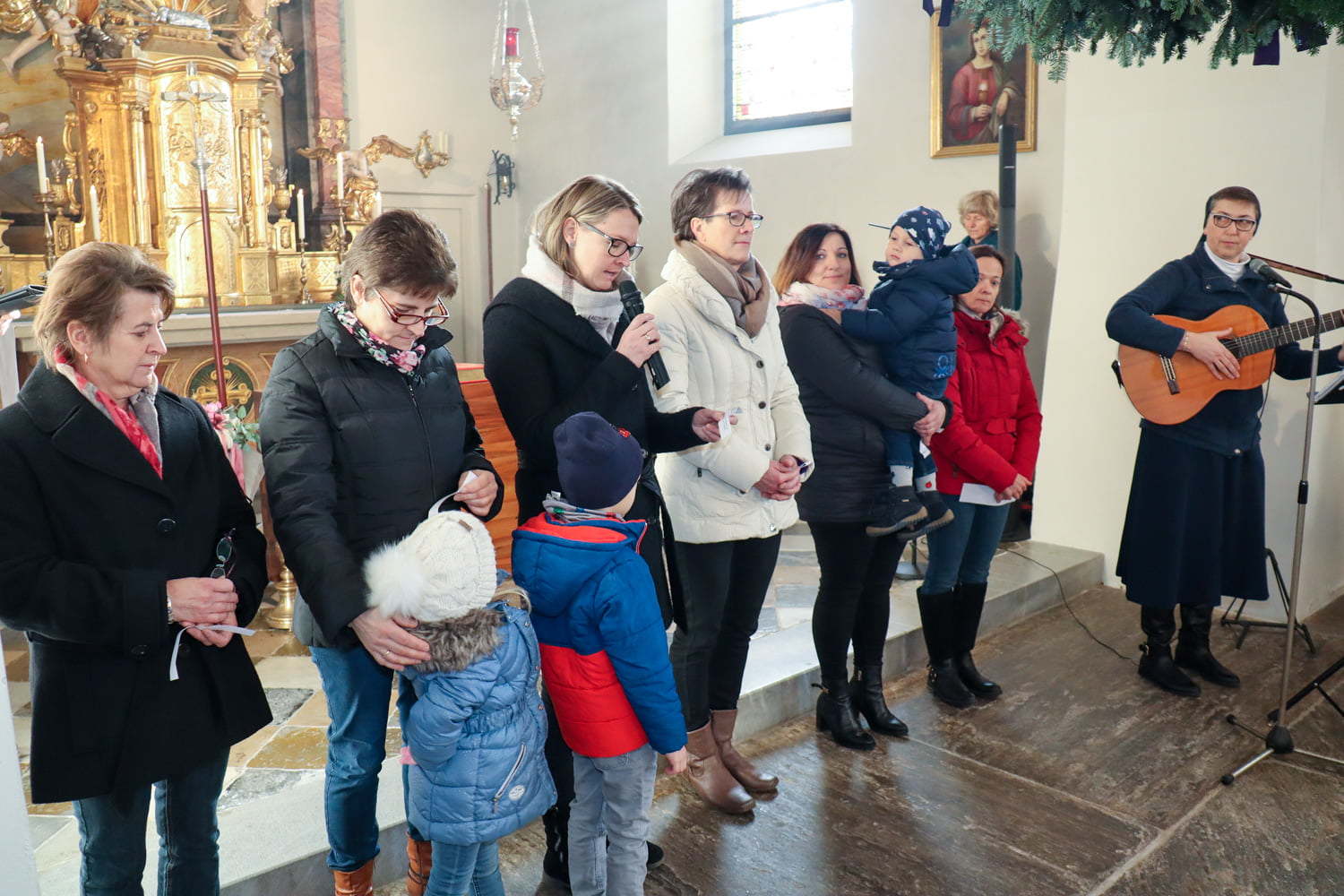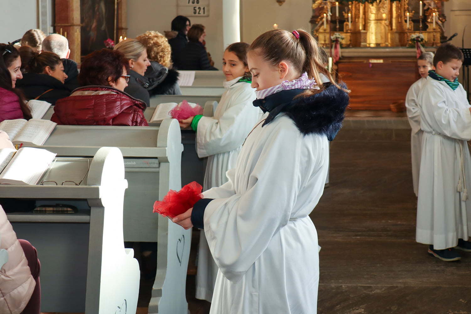 In der Wortgottesfeier ist mehr Raum für neue Elemente. So tanzte Barbara Koren mit einigen Frauen und Kindern den Tanz „Samen der Liebe“. Gebet ist nicht nur reden, singen, still sein … sondern auch mit Leib und Seele, mit dem ganzen Körper meinen Glauben zum Ausdruck zu bringen. Vor dem Segen zeigten die Kinder mit einer symbolischen Handlung – das Aufblühen „einer Blüte“ mit Seidentüchern – was es bedeutet, füreinander zum Segen zu werden.