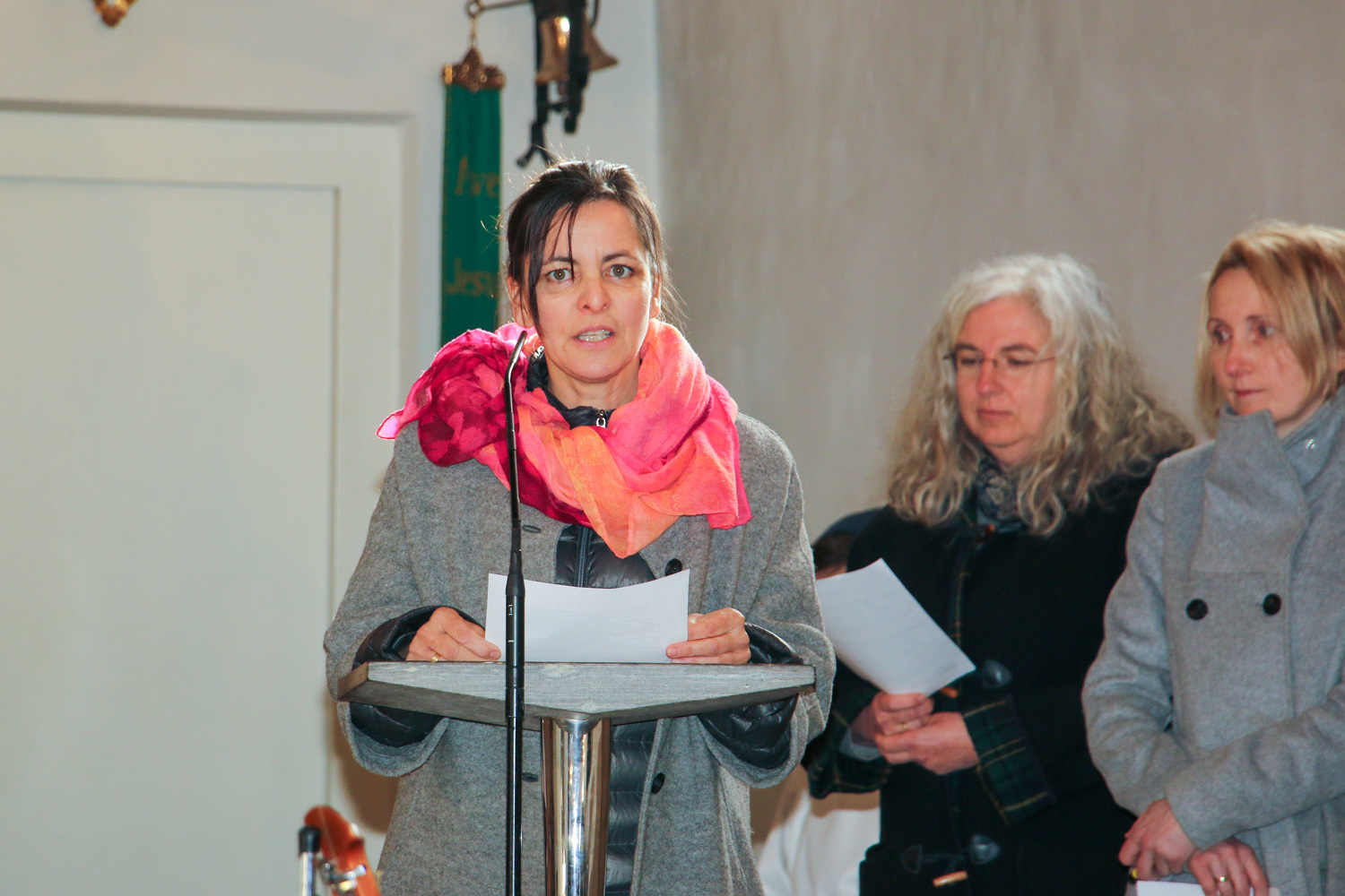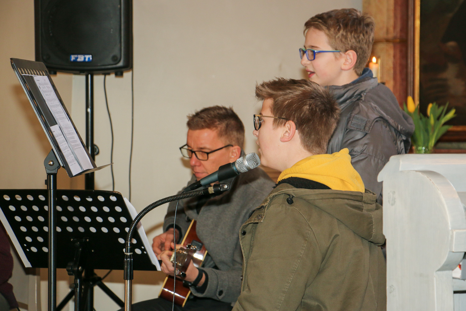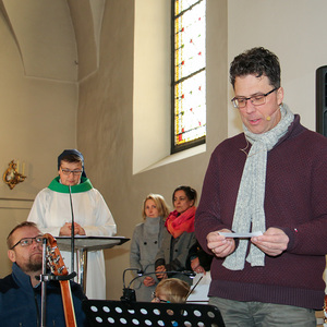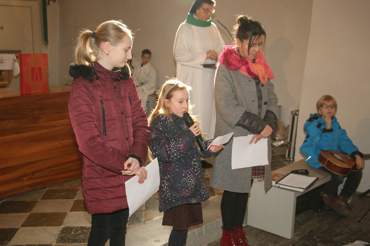 Drei Mütter sprachen bei der Predigt über die Themen aus dem Evangelium (Salz und Licht) und der Taufe. Bei der Taufe stehen drei Symbole im Mittelpunkt: Das Taufwasser, das weiße Kleid und die Taufkerze. Diese Taufkerze brachten die Kinder mit, um sie an der Osterkerze zu entzünden und so an ihre Taufe erinnert zu werden.
