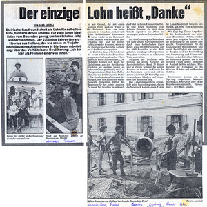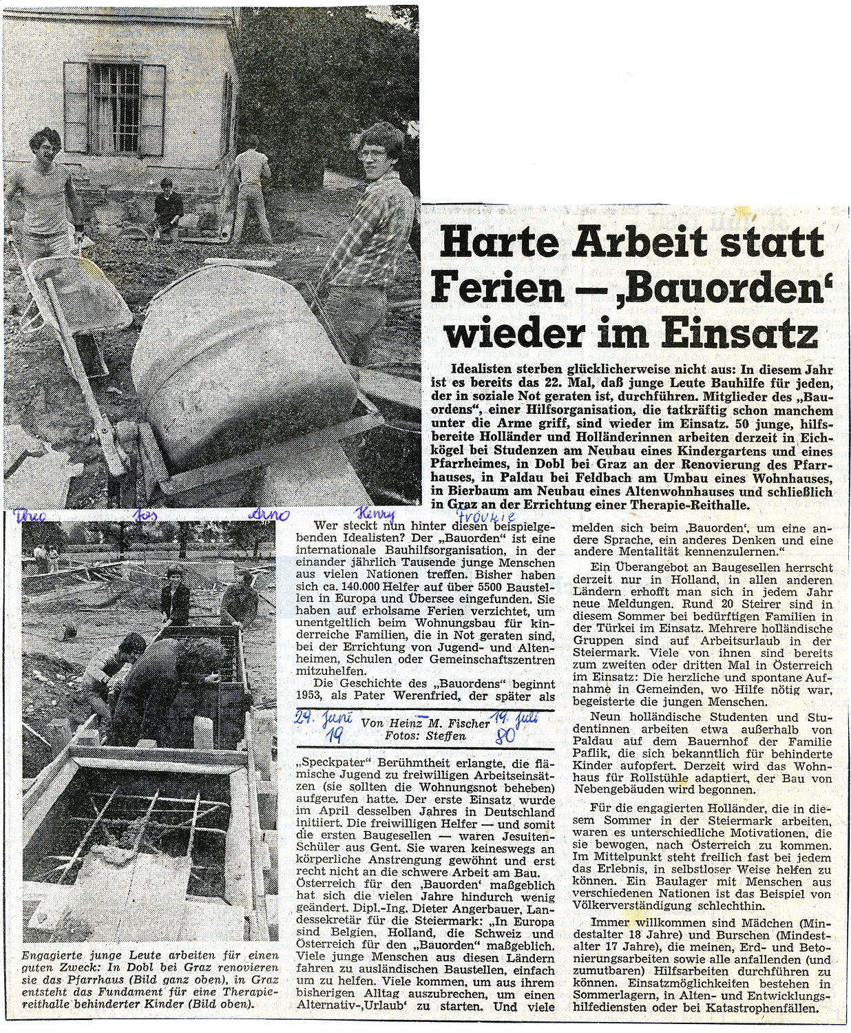 Erste Ausbaustufe bis November. Wie gemeldet, wird im Pfarrhof Dobl ein Gemeindezentrum eingerichtet. Das Ordinariat beauftragte die Architekten Angerbauer — Stummer mit der Planung, Ausschreibung und Bauüberwachung, da zu wenig eigene Kräfte vorhanden waren. In Zusammenarbeit mit dem Pfarrgemeinderat und dessen Bauausschuss entstand ein Konzept, das vom Bauamt genehmigt wurde. Eine Million Schilling zuzüglich der Weingartenstiftung von 112.000 S stehen für 1981 zur Verfügung. Mit diesem Geld werden folgende Leistungen erbracht: Zentralheizung, neue Fenster, neue Elektroinstallation, Baumeisterarbeiten, neue Fußböden, Malerarbeiten, WC-Anlagen usw. Wertvolle Arbeit leistete auch heuer wieder der holländische Bauorden. Wenn alle Arbeiten planmäßig abgeschlossen werden, so stehen ab November zwei Jugendräume im Keller, ein Saal für ca. 70 Personen, ein Besprechungsraum, eine Küche sowie die neue Pfarrkanzlei für die Pfarrarbeit zur Verfügung. Die Gestaltung des oberen Stockwerkes und die Renovierung der Außenfassade müssen auf einen späteren Zeitraum verschoben werden. Ziagl & Senda, September 1981, S. 6 |