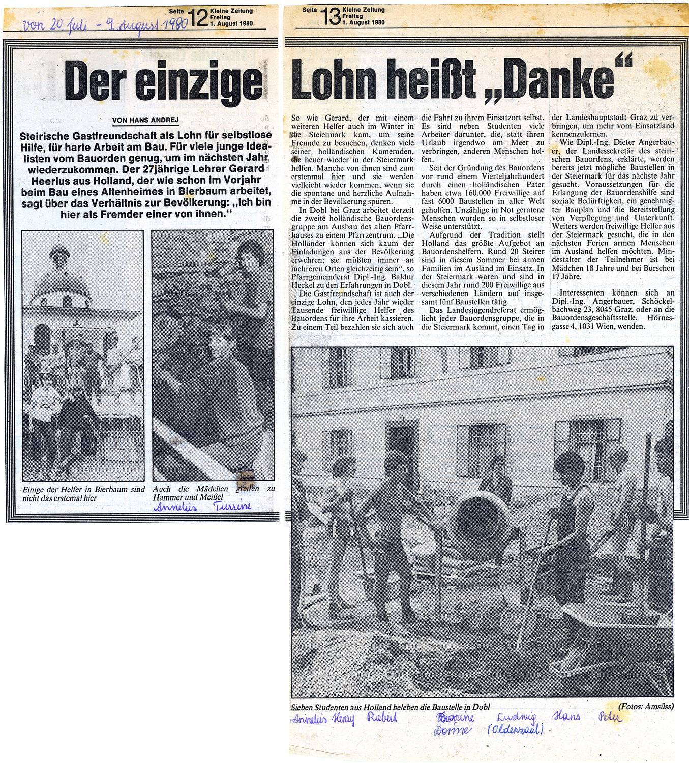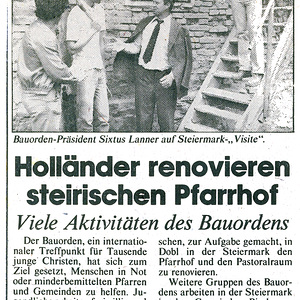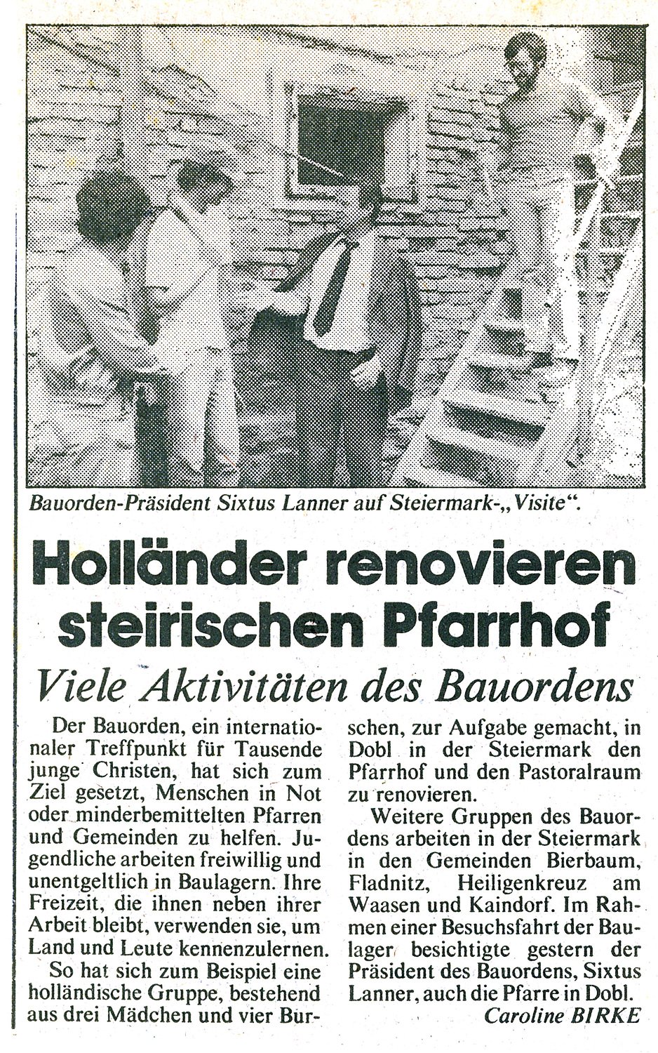 Dobler Pfarrhof – Abschluss der ersten BauetappeNach relativ kurzer Bauzeit konnte am 6. Dezember 1981 der umgebaute Dobler Pfarrhof seiner neuen Bestimmung als Begegnungsstätte für die Dobler Pfarre übergeben werden. Ein kleiner Saal, ein Klubraum, neue Toilettenanlagen, eine Küche, eine Pfarrkanzlei und zwei Jugendräume im Keller stehen nun zur Verfügung und sollen von der Bevölkerung angenommen werden. Es hatte mit dem mutigen Beschluss des Pfarrgemeinderates im Jahre 1979 begonnen, eine Studie zur Sanierung des gesamten Kirchenbereiches durchführen zu lassen. Diese beinhaltete auch die Standortfrage der Aufbahrungshalle. Nun kann die schrittweise Verwirklichung dieser Ideen mit Befriedigung festgestellt werden: Kirche, Aufbahrungshalle, Vorplatz und auch die erste Bauetappe des Pfarrhofes sind abgeschlossen und damit ein wertvoller Beitrag zur Ortsbildgestaltung geleistet. Der Bauausschuss, der die harte, aber verdienstvolle Arbeit gemeinsam mit dem vom Ordinariat beauftragten Architektenbüro Dipl.-Ing. Angerbauer/Dipl.-Ing. Stummer durchgezogen hatte, sieht als größten Wunsch für das Erzherzog-Johann-Jahr die Fertigstellung der Außenfassade und des ersten Stockwerkes, um auch eine Wohnung für einen eventuellen Pfarrhelfer bereit zu haben, vor. Der Versuch des Bischöflichen Ordinariates, einen nicht bewohnten Pfarrhof, deren es in der Steiermark schon sehr viele gibt, durch ein Architektenbüro und den örtlichen Pfarrgemeinderat bzw. Bauausschuss planen und beaufsichtigen zu lassen, ist ein in der Steiermark erstmaliger Modellfall. Da auch die Kosten im vorgesehenen Rahmen bleiben, ist dieser Versuch als Vorbild für die Harmonisierung zwischen örtlichen und zentralen Wünschen zu bezeichnen. Der Einsatz des holländischen Bauordens war bei diesem Umbau ein besonderes Erlebnis für die Pfarrbevölkerung. Es kann durchaus sein, dass der Dobler Pfarrhof erst durch das Miterleben des selbstlosen Einsatzes der Bauordensgesellen zur Angelegenheit der Bevölkerung wurde. Hieß es nicht vorher, der Pfarrhof sei Sache des Ordinariats? So wirkten die Zusammenarbeit und die gastfreundliche Aufnahme des Bauordens in vielen Familien gemeinschaftsfördernd für die ganze Pfarre. Der österreichische Bauorden überreicht aus diesem Anlass am 6. Dezember an Frau Theresia Leitl und Herrn Mitteregger als Dank und Anerkennung die St.-Martins-Medaille. FINANZIERUNG: Das Ordinariat hat 1 Million Schilling zum Umbau zur Verfügung gestellt und zusätzlich die Planungskosten übernommen. Weiters hat die Gemeinde Dobl 100.000 Schilling als Beitrag zu den Toiletten in Aussicht gestellt. Ein Rest von 100.000 Schilling aus der Weingartenstiftung steht ebenso zur Verfügung. LEISTUNG: Neue Fenster in altem Stil, Heizung für feste Brennstoffe und Öl, Toilettenanlagen, Kläranlage, Elektroinstallation, Ausbau des Jugendkellers, Ausmalen, Türenstreichen, neue Fußböden mit Ausnahme der alten Fliesen, neuer Eingang – dadurch Gewinn eines Raumes. Nach Abschluss der Arbeiten werden sich die Bauleute zurückziehen und offen bleibt die Frage, welcher Geist dieses Haus nun füllen wird. Diese Frage kann nur von Ihnen, lieber Leser, lieber Mit-Christ, beantwortet und gelebt werden. Ziagl & Senda, Dezember 1981, S. 8 |