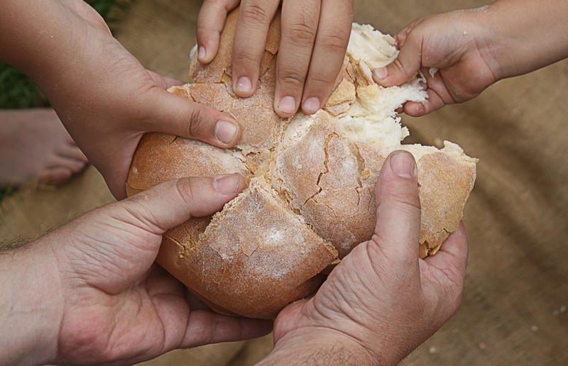Unsere Hände sind offen wie eine Schale. Wir haben ein Stück Brot in unseren Händen.
