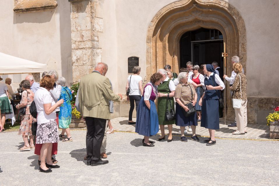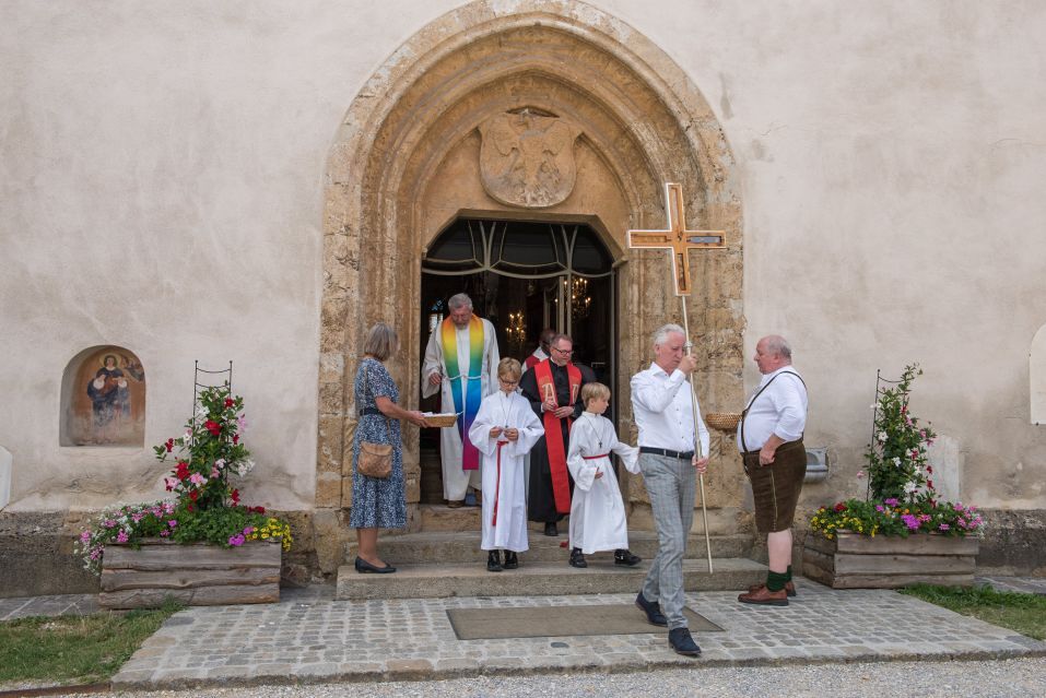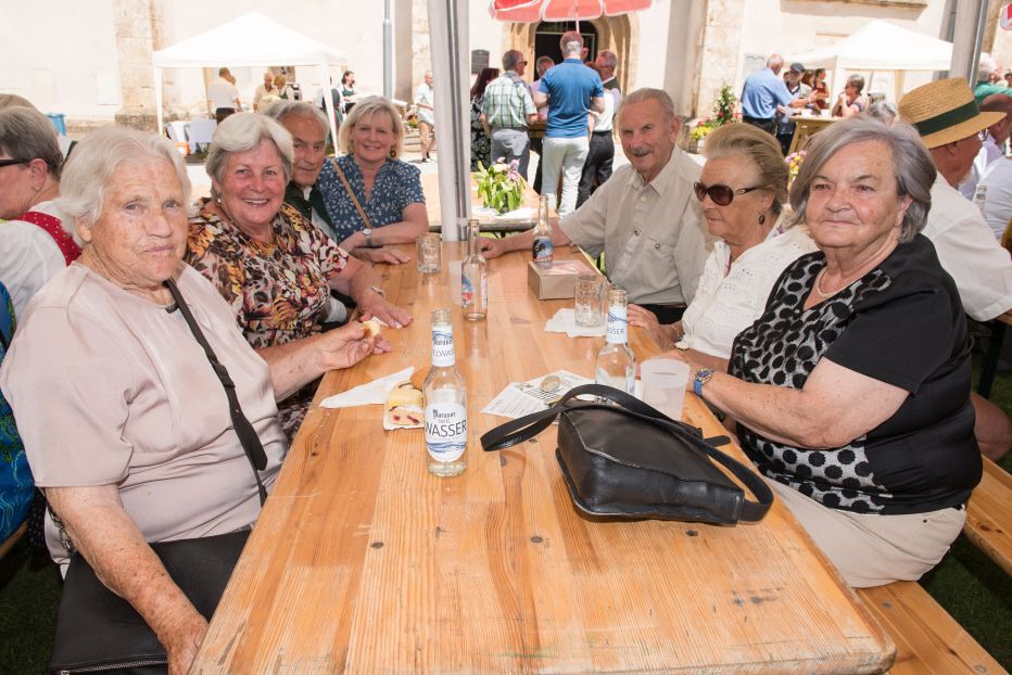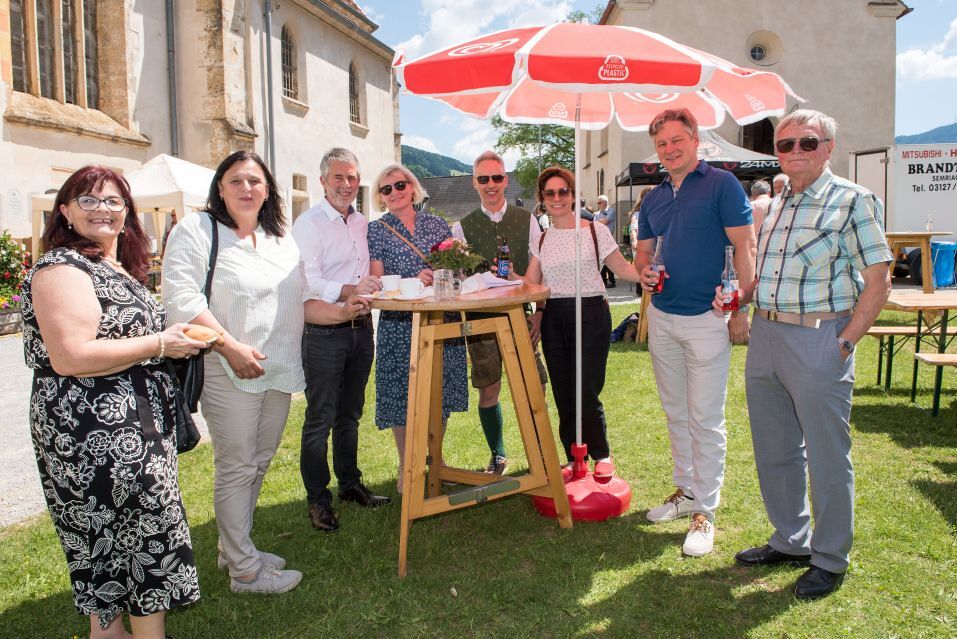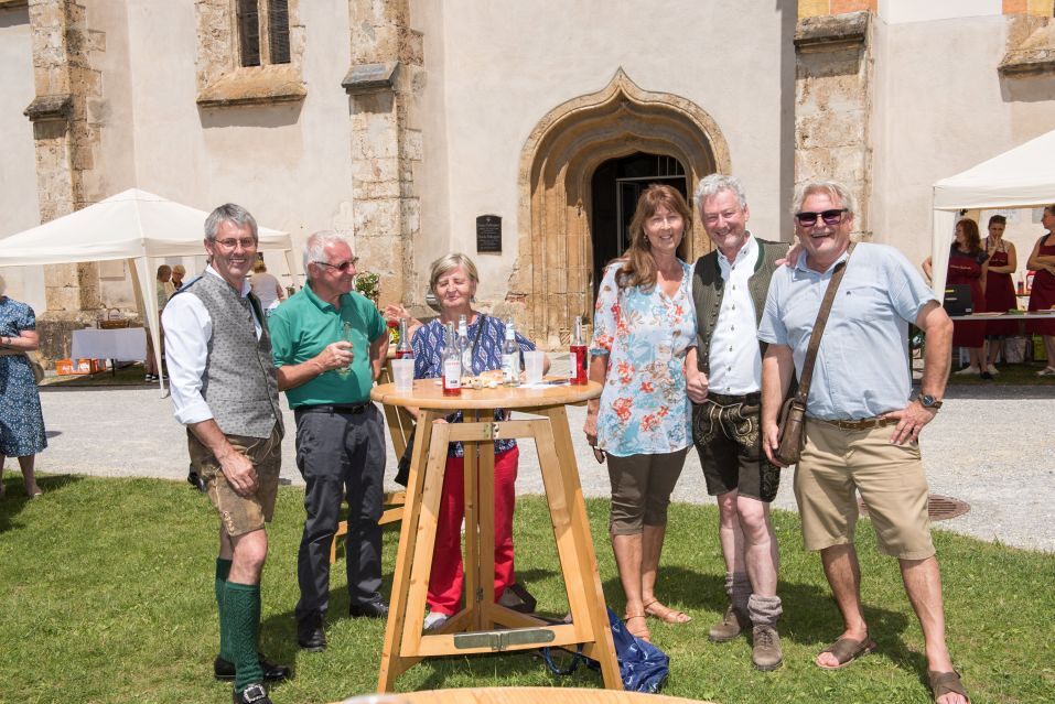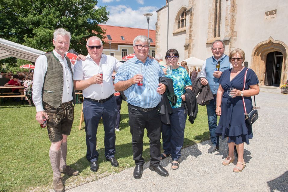 Gesellig ging es vor der Kirche weiter: Kühle Getränke halfen bei der hohen Temperatur, Frankfurter, Aufstrichbrote und Kuchen gegen den Hunger, außerdem war unter anderem für musikalische Unterhaltung gesorgt. Insgesamt war dieses Startfest eine Premiere:  Die sieben Pfarren Röthelstein, Frohnleiten mit Adriach, Übelbach, Deutschfeistritz mit Peggau, Stübing, Gratkorn und Semriach haben Messfeier und Fest miteinander und gemeinsam vorbereitet und organisiert.  Der Start in die Zukunft Kirche bei uns ist gelungen!