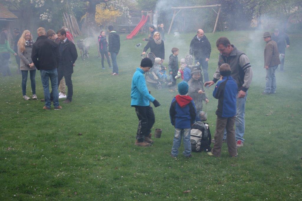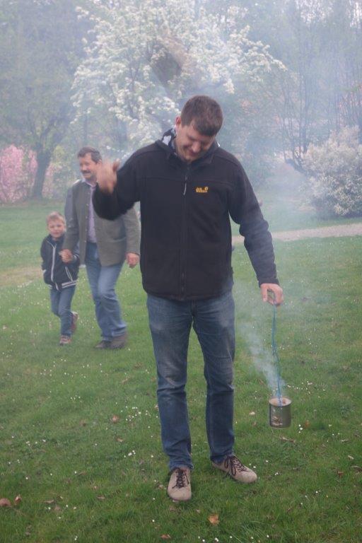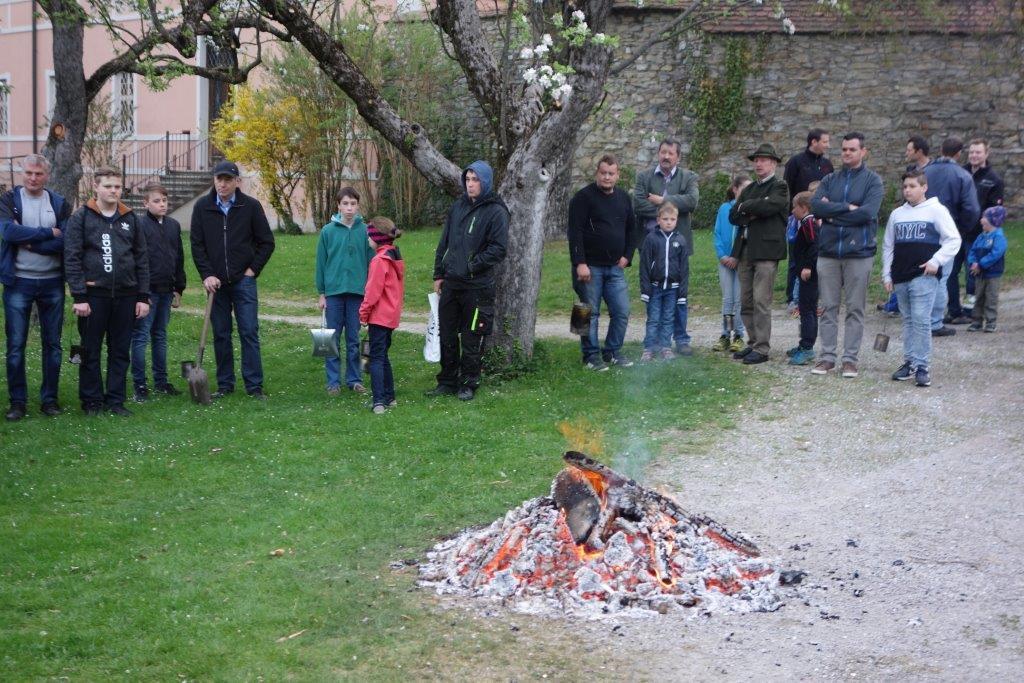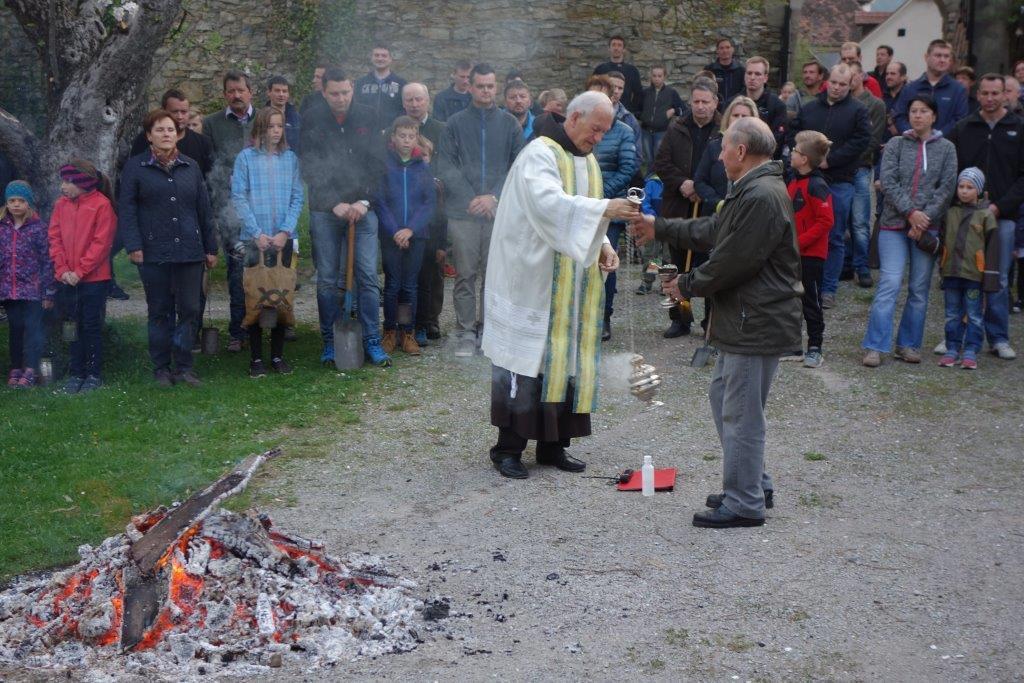 Am Karsamstag um 7 Uhr früh kamen viele Kinder, teilweise mit ihren Eltern oder Großeltern, aber auch viele Erwachsene in den Klostergarten, um an der Feuerweihe teilzunehmen. Das Feuer wurde von Hans Rappold vulgo Rebinger schon frühmorgens entfacht. Diese lobenswerte Tätigkeit führt er schon über 40 Jahre aus. Das Feuer wurde dann von Pater Simon ohne Unterstützung von Ministranten gesegnet.