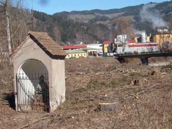 Seit Februar dieses Jahres errichtet die Firma Mondi Frohnleiten GmbH eine neue Brücke über die Mur – einerseits wegen des schlechten Bauzustandes der bestehenden Murbrücke und andererseits deshalb, weil der Bau eines neuen Murkraftwerkes geplant ist. Bei den dafür notwendigen Rodungsarbeiten im Auwald wurde ein lange Zeit darin verborgener Marien-Bildstock wieder sichtbar, der vor genau 50 Jahren von einer Stelle an der alten Bundesstraße unmittelbar neben dem Murknie hierher versetzt und renoviert worden war. Damals wurde diese Grünanlage zwischen der Mur, der sogenannten „Koiner-Garage“ und dem Gamsbach angelegt, wobei man laut einem Bericht der „Schweizerpost“ besonders darauf Wert legte, keine künstliche Parkanlage zu schaffen, sondern einen natürlichen Auwald. Der frisch renovierte Bildstock, den man unter einer großen Fichte aufstellte, war ein besonderes Schmuckstück dieses Naherholungsgebietes. Er wurde am 22. Juli 1958 durch Dechant P. Meinrad Maurer vom Stift Rein im Beisein des damaligen Priors P. Angelikus M. Schwarzenbach vom Servitenorden feierlich eingeweiht.