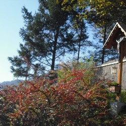 Unter dem Kruzifix sind eine weiße Laterne und ein Blumenkisterl angebracht. Ein Betonfundament sorgt für einen sicheren Standort. Sohn Patrik Neuherz, ein gelernter Spengler, stattete dieses Wegkreuz kunstvoll mit einem Kupferdach aus. Zwischen den gepflanzten Sträuchern ist auch ein Zugang möglich.