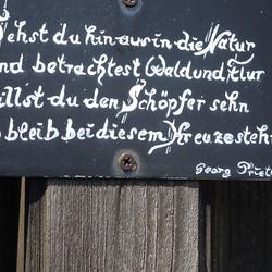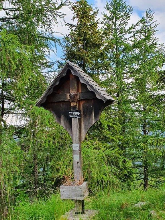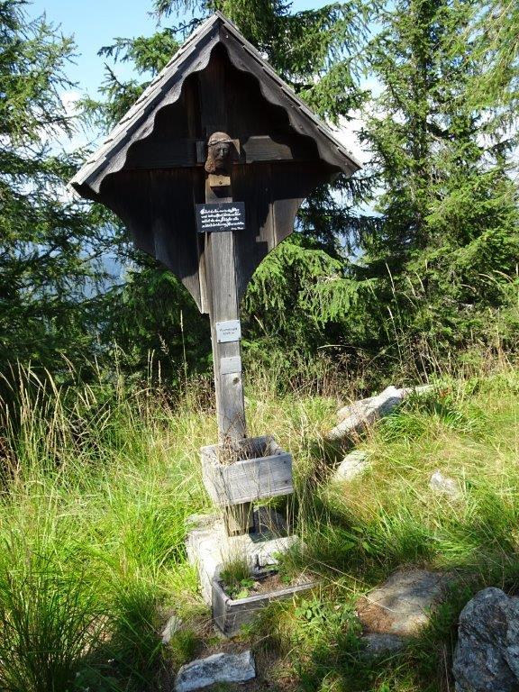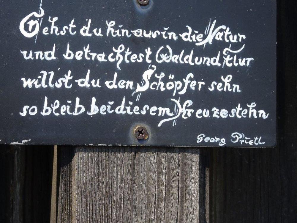 Das Aufstellen eines Kreuzes auf dem Gipfel war ein langgehegter Wunsch des früheren Besitzers Georg Prietl vulgo Fuchs. Leider konnte er die feierliche Segnung nicht mehr miterleben, er war bereits am 8. August 1995 verstorben. Von ihm stammt aber der sinnige Spruch, der auf einer kleinen schwarzen Tafel mit weißer kunstvoller Handschrift am Holzkreuz steht: