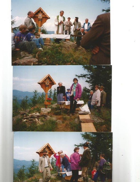 Die Segnung nahm im Rahmen einer Gipfelmesse Pater Simon Orec mit rund 100 Messbesuchern vor. Großer Dank gebührt den Pfarrbewohnern Josef Affenberger für die Durchführung der erforderlichen Holzarbeiten, es war damals bereits sein sechstes Gipfel- oder Marterlkreuz, sowie Walter Kögler für die Bewerkstelligung der schwierigen Maurerarbeiten auf dem felsigen Plateau und dem Ehepaar Gabriele und Peter Prietl vulgo Fuchs, Hofamt 26, auf deren Grund das Gipfelkreuz errichtet werden konnte.