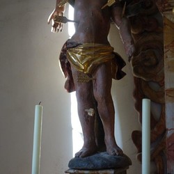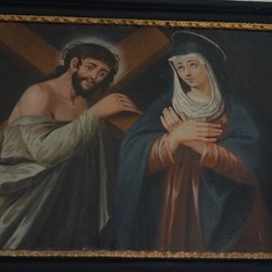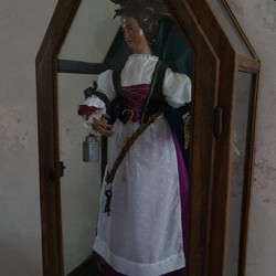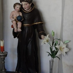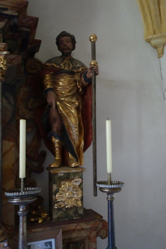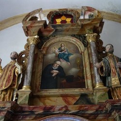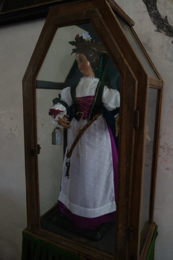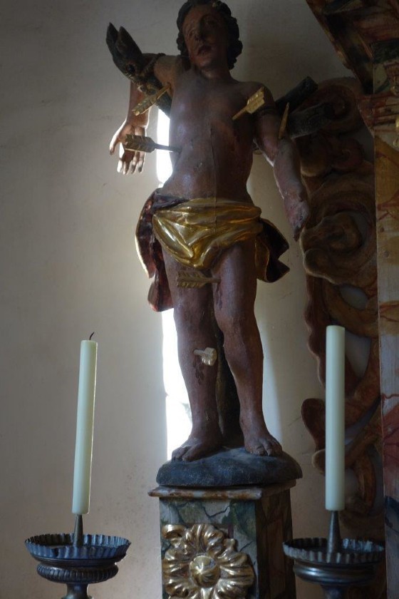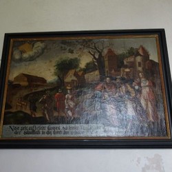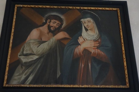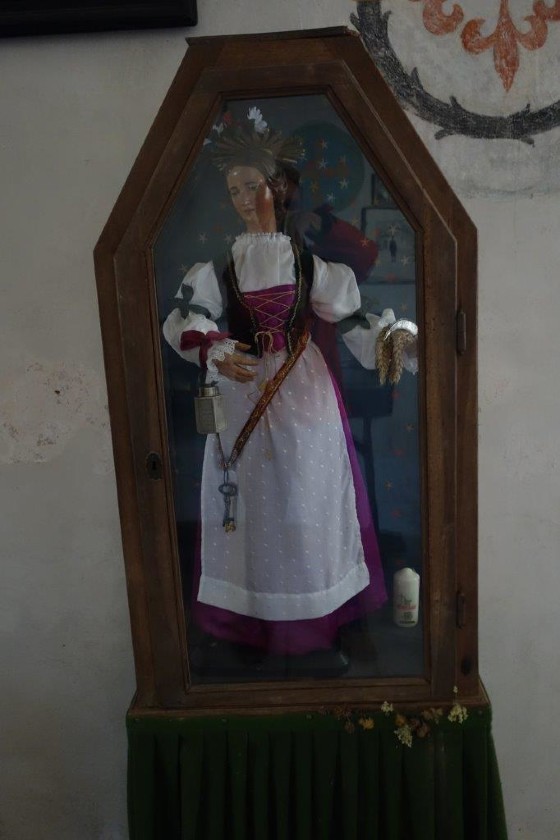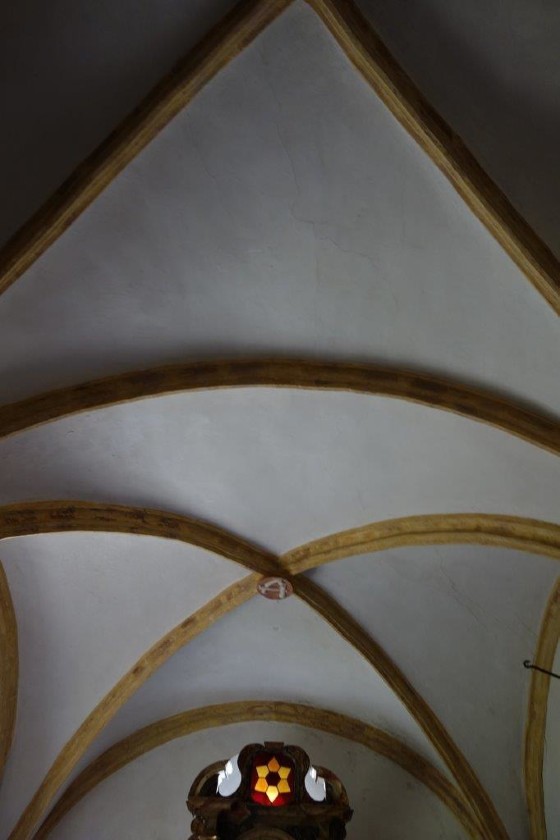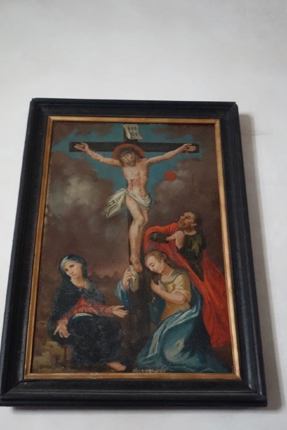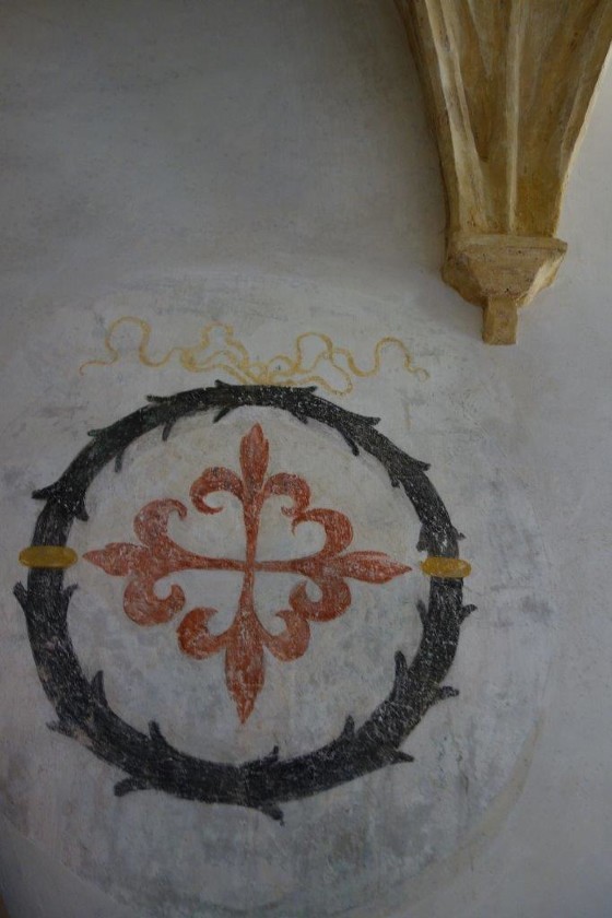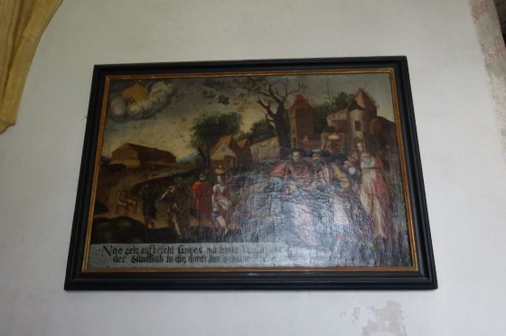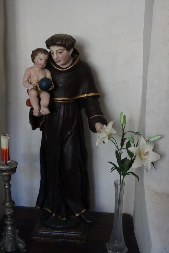 Über dem Schrank befinden sich ein freigelegtes spätgotisches Apostelkreuz und ein Bild von der Verehrung Jesu mit nackter Schulter. An der rechten Wand hängt ein bemerkenswertes Ölgemälde, ebenfalls aus der Spätgotik, mit einer Inschrift über die Begehung der Arche Noah. In der Nische unter dem zur Turmkammer angrenzenden Fenster ist eine Statue des heiligen Antonius und rechts daneben ein Kreuzigungsbild vorhanden.