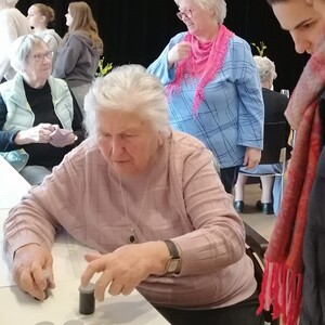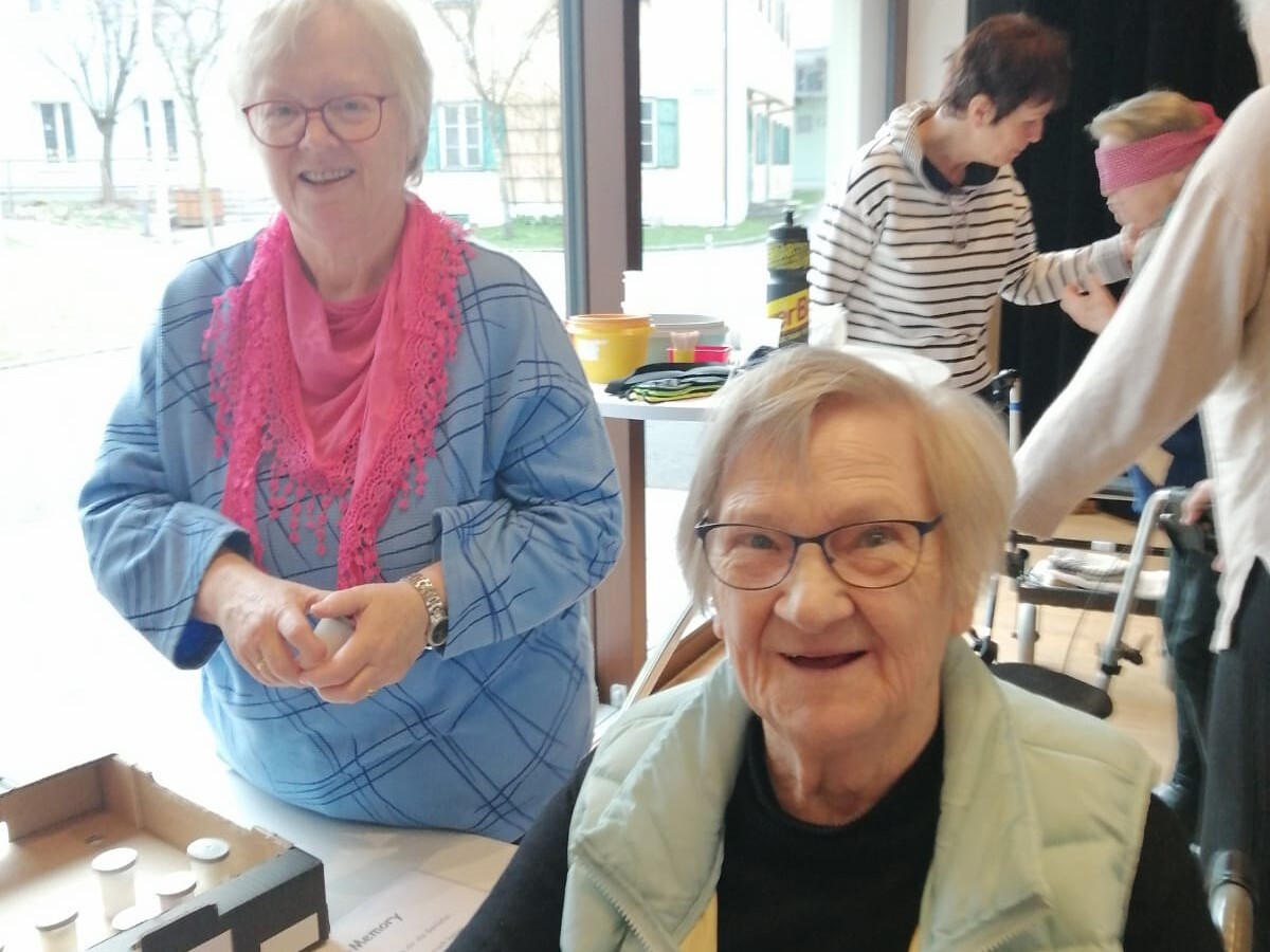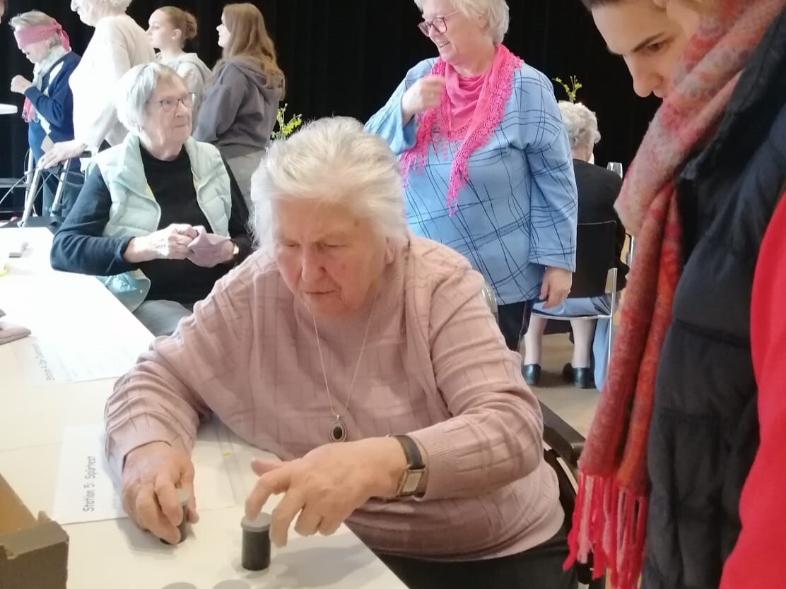 Eine gelungene Idee war der Weg der Sinne, der von Frau Michaela Moser vor­be­rei­tet wurde. Mit Begeisterung waren alle Senioren dabei und ver­such­ten sich im bewussten Wahrnehmen ihrer Sinne. Ob rie­chen, schmecken oder das Gedächtnis ausprobieren, es machte den Teil­neh­men­den großen Spaß.