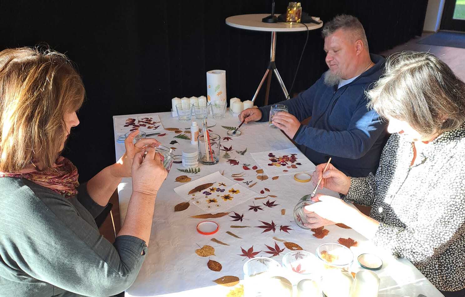 Im Vorfeld des Be­geg­nungs­nach­mit­tags wur­den eifrig Blätter und Blüten ge­sam­melt und ge­presst, die dann mit et­was Ser­viet­ten­kle­ber auf Glä­sern oder ein­fach nur mit dem Bügel­eisen auf Kerzen an­ge­bracht wurden. So entstanden bunte Lichtbringer, die die herbst­lich­en Farben fest­hal­ten und etwas Freude und Licht in die grauen No­vem­ber­tage brin­gen kön­nen.