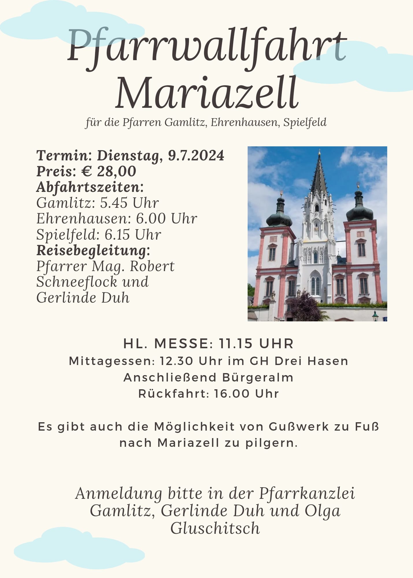 Wir freu­en uns - ab so­fort- auf Eu­re An­mel­dung! Ma­ri­a­zell ist der be­deu­tend­ste Wall­fahrts­ort in Ö­ster­reich und wird von un­zäh­li­gen Men­schen, aus ver­schie­den­sten Grün­den, im­mer wie­der ger­ne be­sucht. Auch in un­ser­em Pfarr­ver­band wird wie­der ei­ne ge­mein­sa­me Wall­fahrt or­ga­ni­siert. Nä­he­re De­tails fin­dest du am Flug­blatt.
