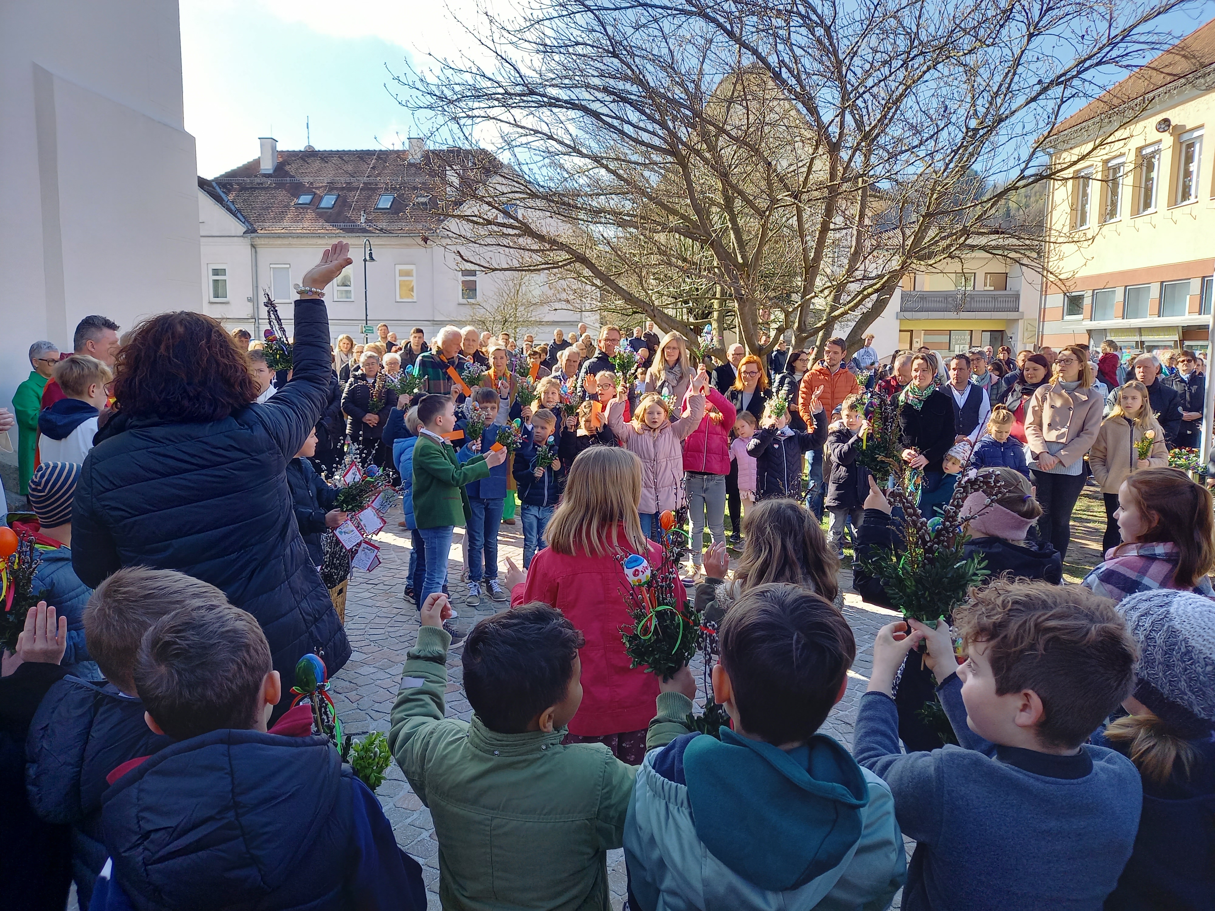 "Es ist kein Gras über die Sa­che ge­wach­sen" - das wird durch die vie­len Men­schen deut­lich, die ge­mein­sam am Kirch­platz die Palm­seg­nung fei­ern und die ge­mein­sam die Kar­wo­che durch­le­ben und mit­ge­hen. Bis hin zur Auf­er­steh­ung - durch sie wur­de "der Stein ins Rol­len ge­bra­cht".