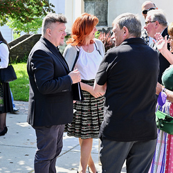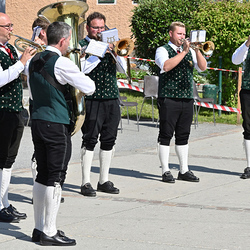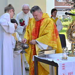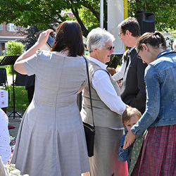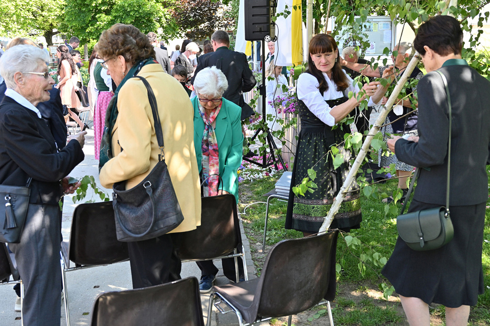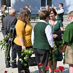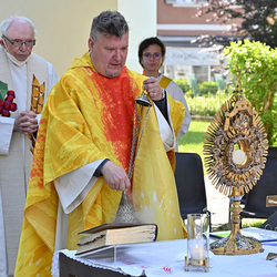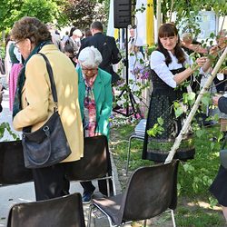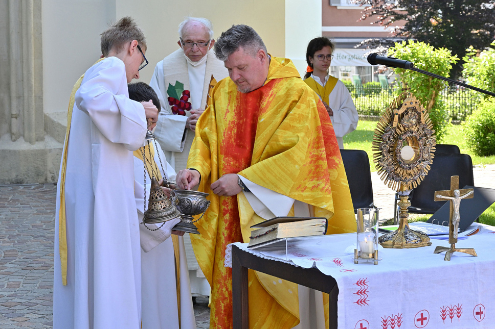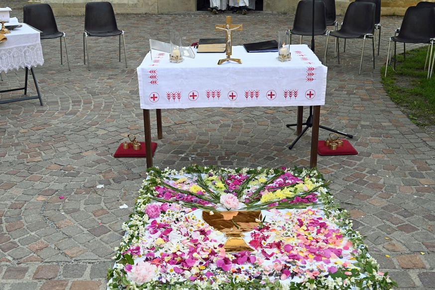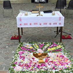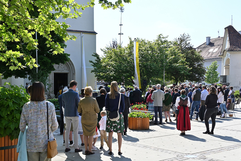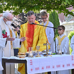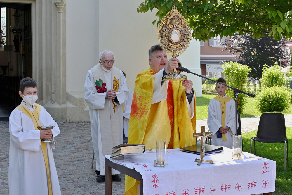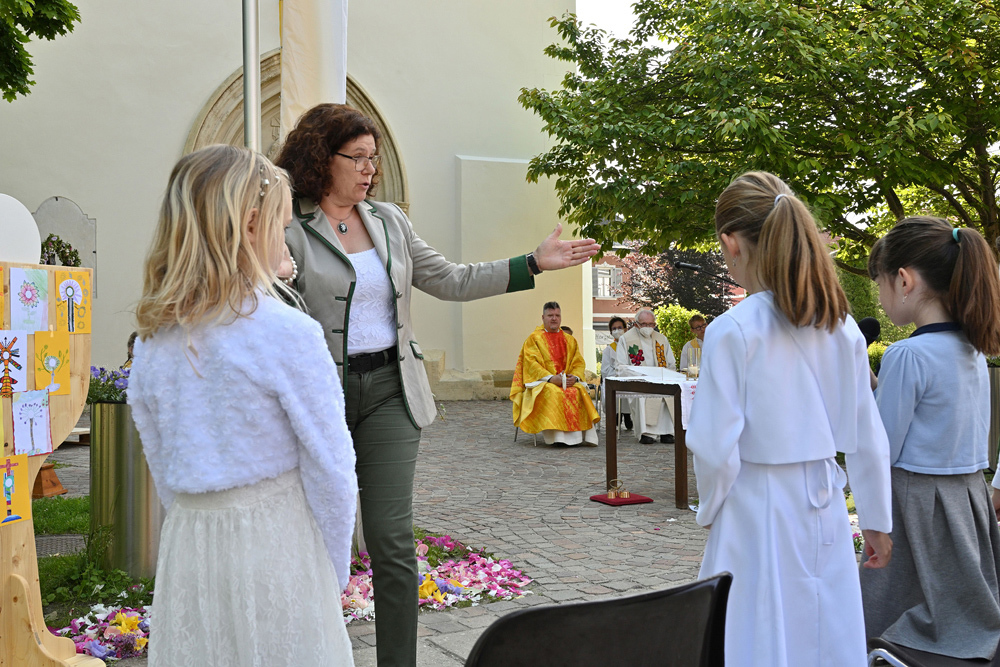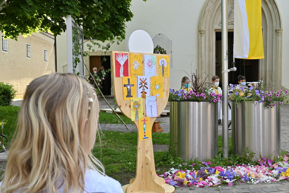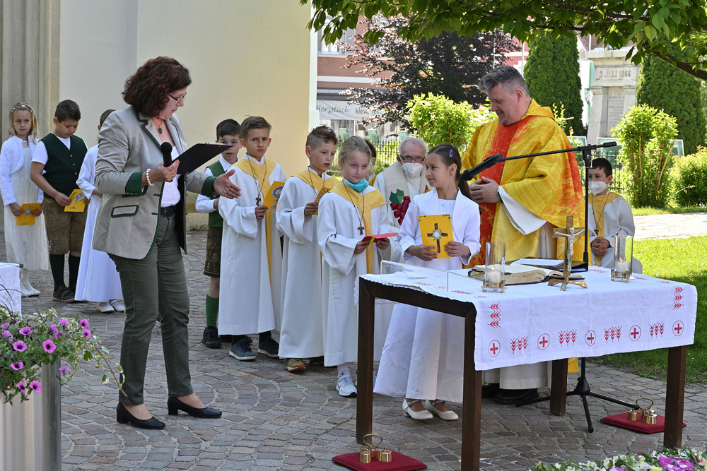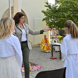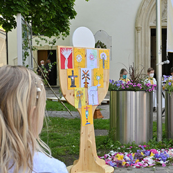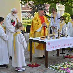Das „Hochfest des Leibes und Blutes Christi“ feierte die Pfarr­gemeinde Gamlitz auf dem Kirch­platz bei herrl­ichem Wetter. – Pfarrer Robert Schnee­flock erläu­terte das Geheim­nis des Fron­leich­nam­festes aus­gehend von einem An­spruch unserer Zeit, nämlich (immer) alles geben zu müssen: Jesus gab alles - seinen Leib und sein Blut - am Kreuz für unsere Erlösung hin. – Für den Blumen­schmuck vor dem Altar und die fröh­lichen Lieder wäh­rend der Messe (Gitarre: Christina Riegel­negg) sorgten Erst­kom­munion­kinder unter Rel.-Lehrerin Monika Pein. Der Kirchen­chor und das Bläser­ensemble der Markt­musik Gamlitz ergänzten die musika­lische Um­rahmung. – Pfarrer Schnee­flock spendete den Eucharis­tischen Segen auf dem Kirch­platz, eine Prozession mit dem Aller­heiligsten durch den Ort entfiel Corona-bedingt. (Robert Glück, 05.06.2021)