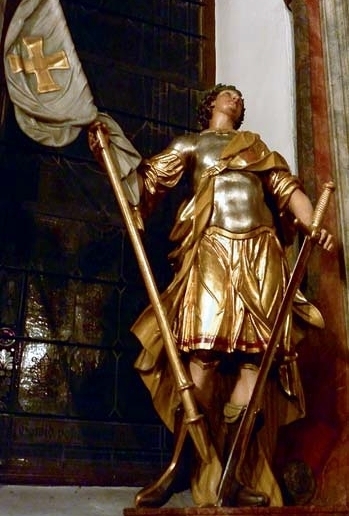 Dargestellt wird er in unserer Pfarrkirche als römischer Soldat mit einem Schwert und einer weißen Fahne mit goldenem Kreuz.