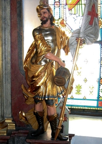 Dargestellt als römischer Soldat mit einer weißen Fahne mit rotem Kreuz und einem Wassereimer aus dem er Wasser auf ein brennendes Haus schüttet.