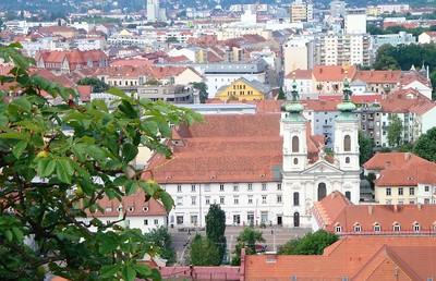 Der Grundstein zur Kirche wurde im Jahre 1607 gelegt, Weihen sind für 1611 und 1636 belegt. Entgegen der Tradition ist der Bau gewestet, wohl um die Schauseite gegen die Stadt Graz ausrichten zu können. Der Entwurf der Fassade ist urkundlich für den Hofmaler Giovanni Pietro de Pomis belegt, dem die Pläne für den gesamten Kirchenbau zugeschrieben werden. Von ihm stammt auch das im selben Jahr geschaffene Gnadenbild.