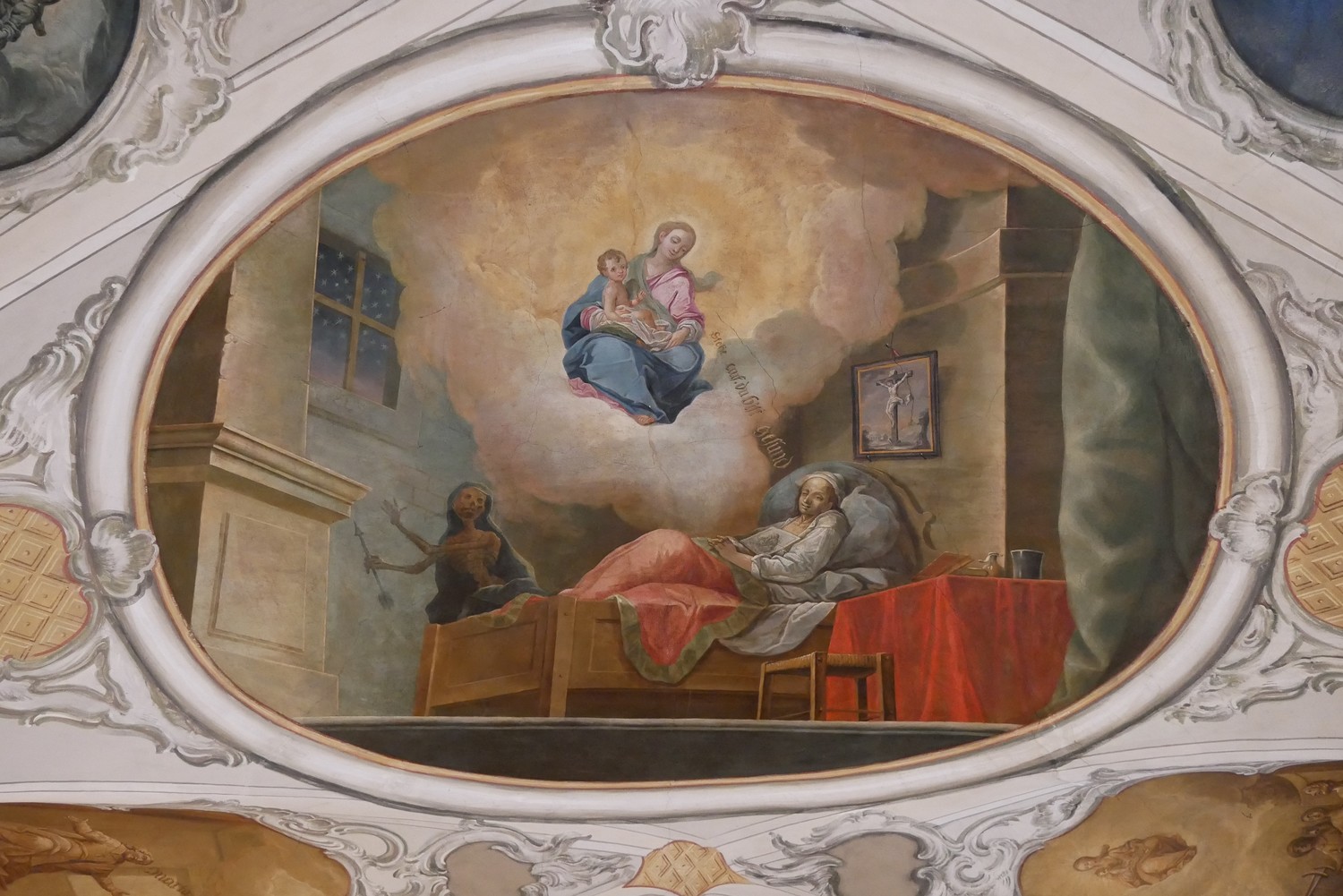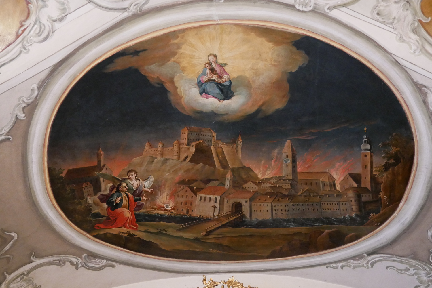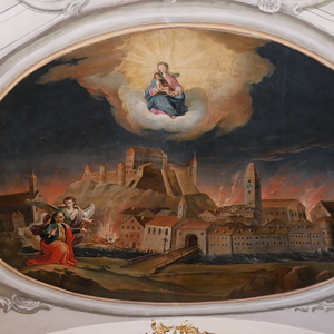Die insgesamt 15 Deckenbilder zeigen in der Gewölbemitte drei große Szenen: im Norden die brennende Stadt Pettau (Ptuj) im heutigen Slowenien, im Süden eine Pestheilung in Graz mit der Ansicht des dortigen Hauptplatzes und im Zentrum die Darstellung des Gnadenbildes Mariahilf, als Stadtmutter über Graz schwebend. Die im Vordergrund kniende Gestalt ist die Personifikation der Steiermark mit Herzogshut und dem Landeswappen mit dem steirischen Panther, die der Gottesmutter ein brennendes Herz entgegenhält. Im linken Drittel des Bildes sind am rechten Murufer die Doppeltürme der Mariahilfkirche zu erkennen.