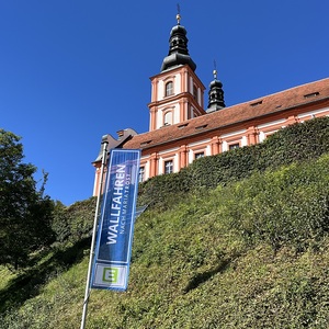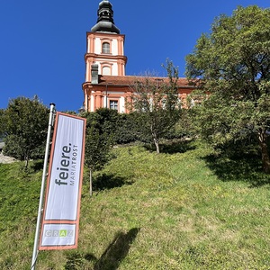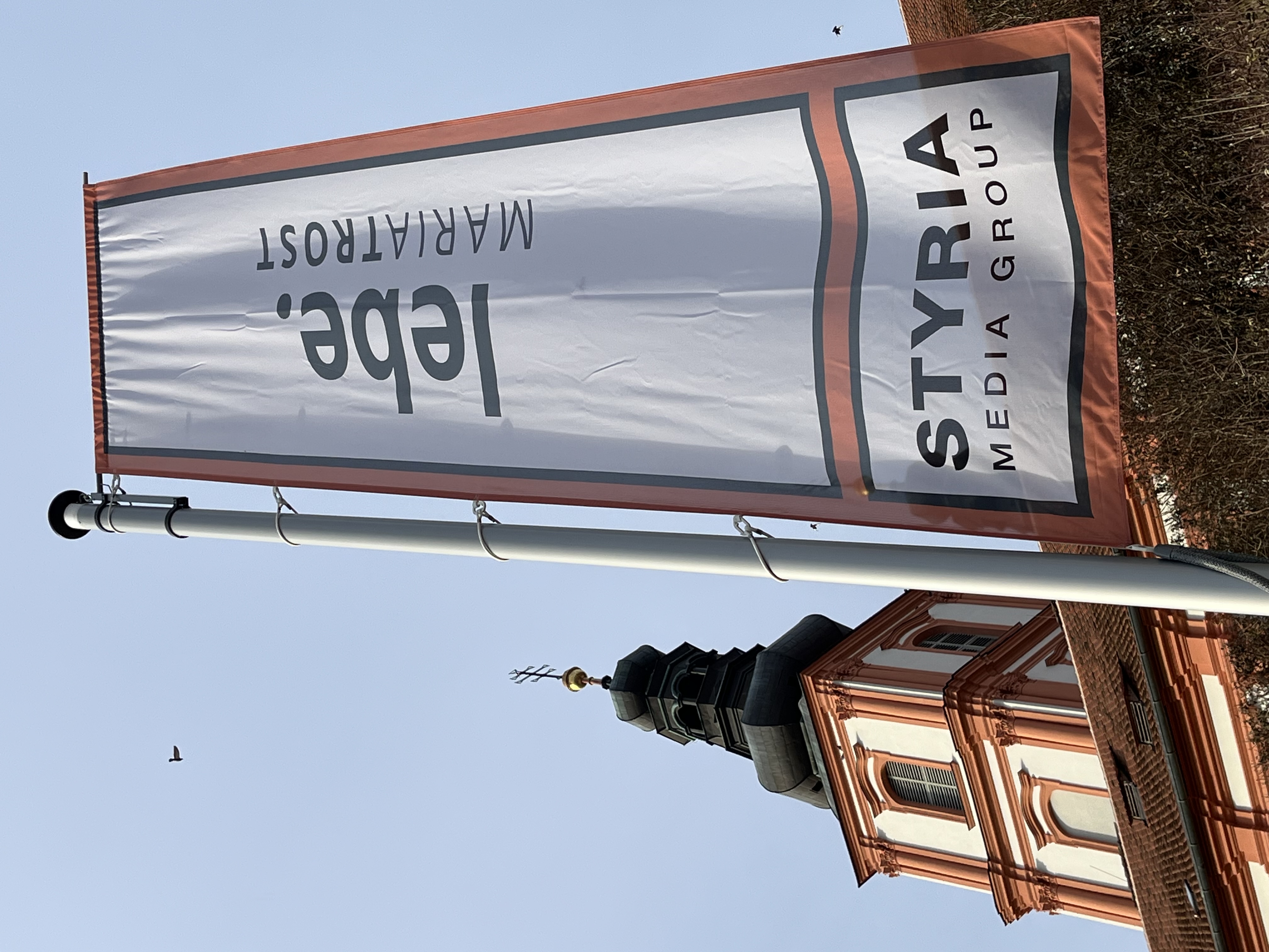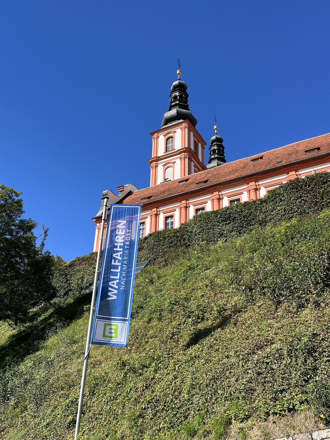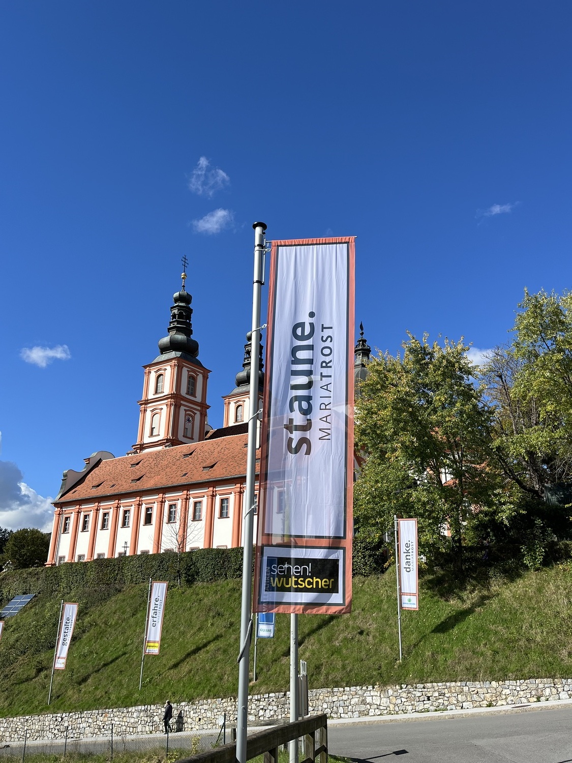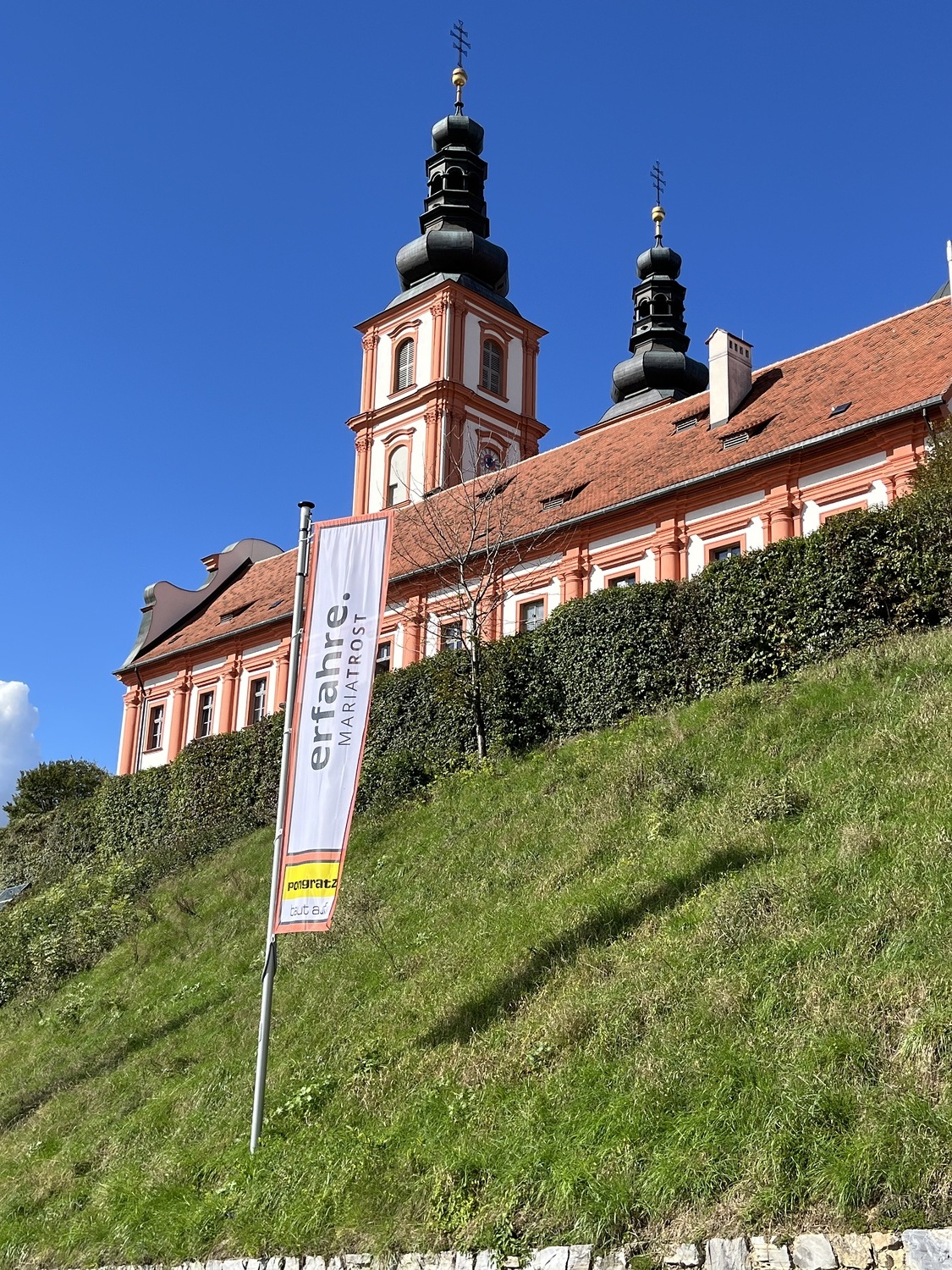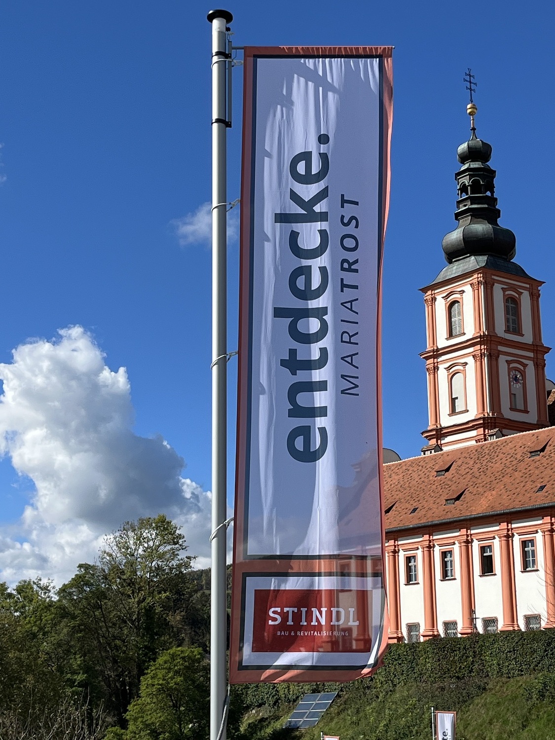 Mit einem Gedankenimpuls laden die Fahnen die Besuchenden zu einem vielfältigen Erleben von MARIATROST ein.