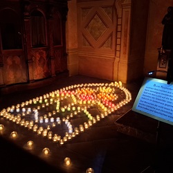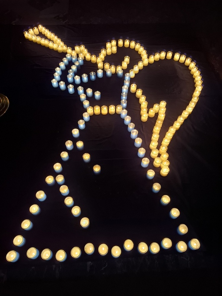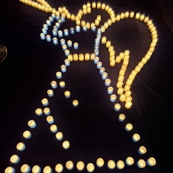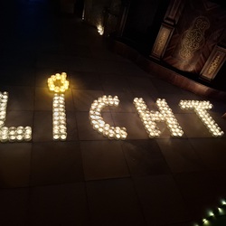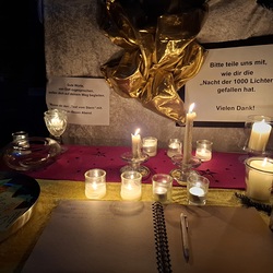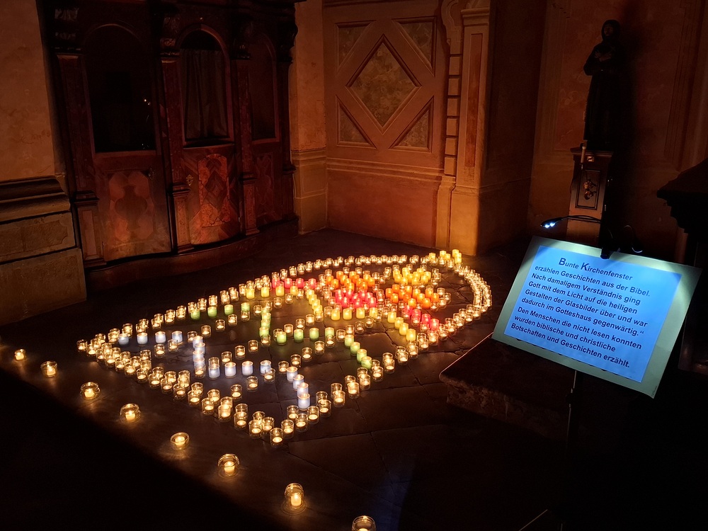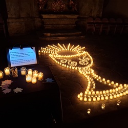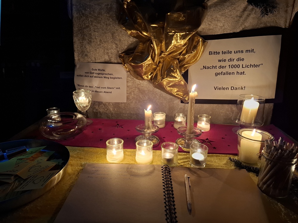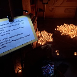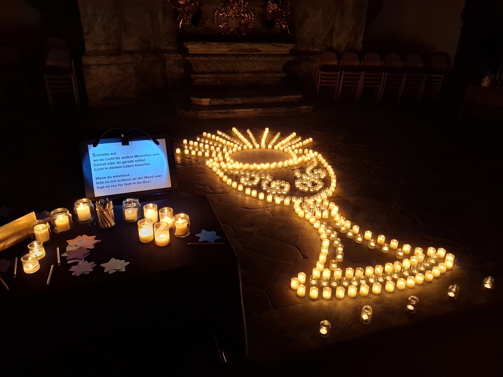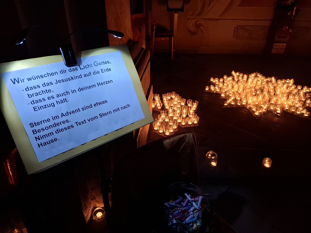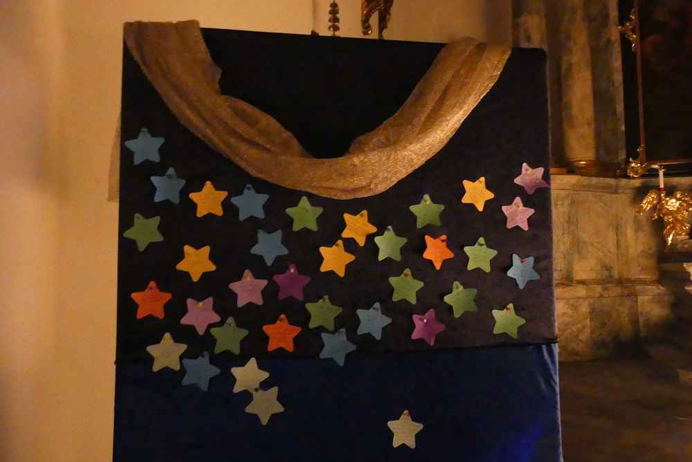 Viele, aus Kerzenlichtern gestellte Figuren konnten bestaunt werden: ein Engel, ein Kelch, ein buntes Kirchenfenster, Sterne in allen Varianten, ein schön beleuchteter Altarraum mit einem Engel und der Engel des Herrn in verschiedenen Sprachen, ein Sternenhimmel und vieles mehr. Als Besucher konnte man sich auch aktiv beschäftigen – einen Leuchtstein in den Himmel legen und ein Sterngedicht mit nach Hause nehmen.