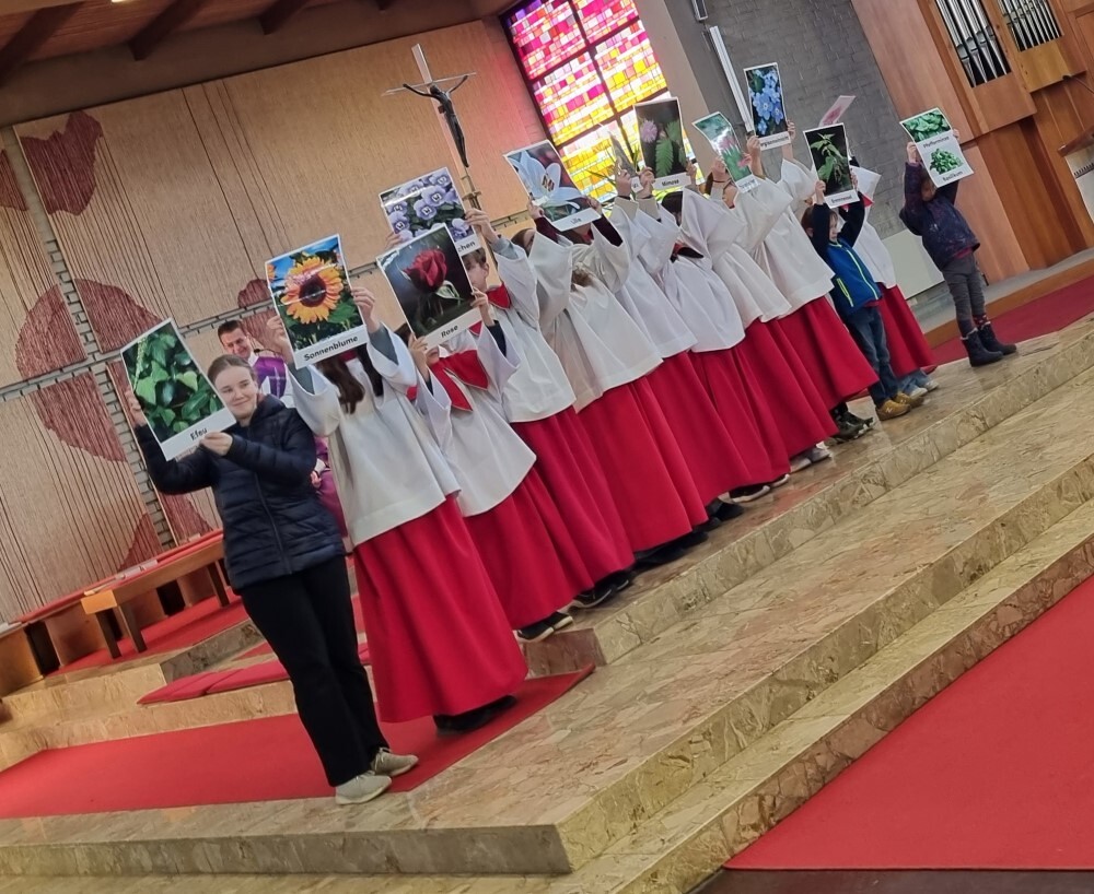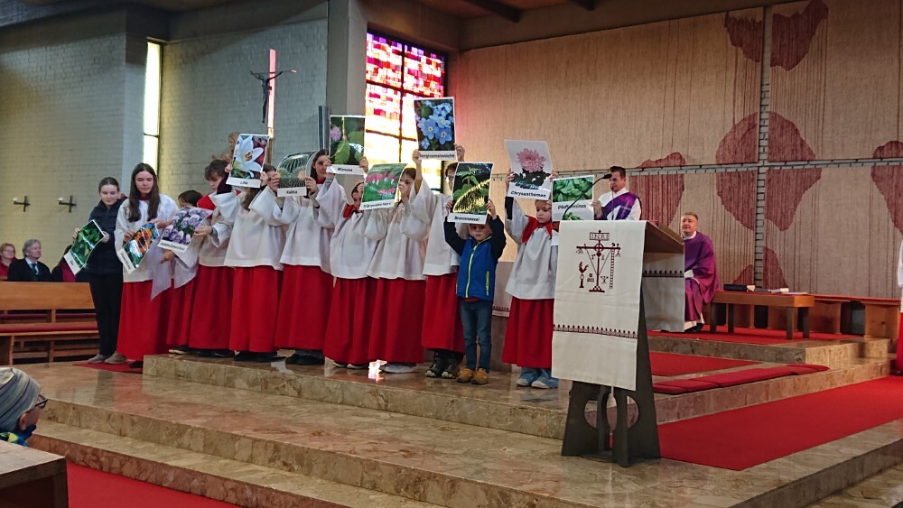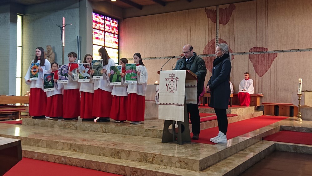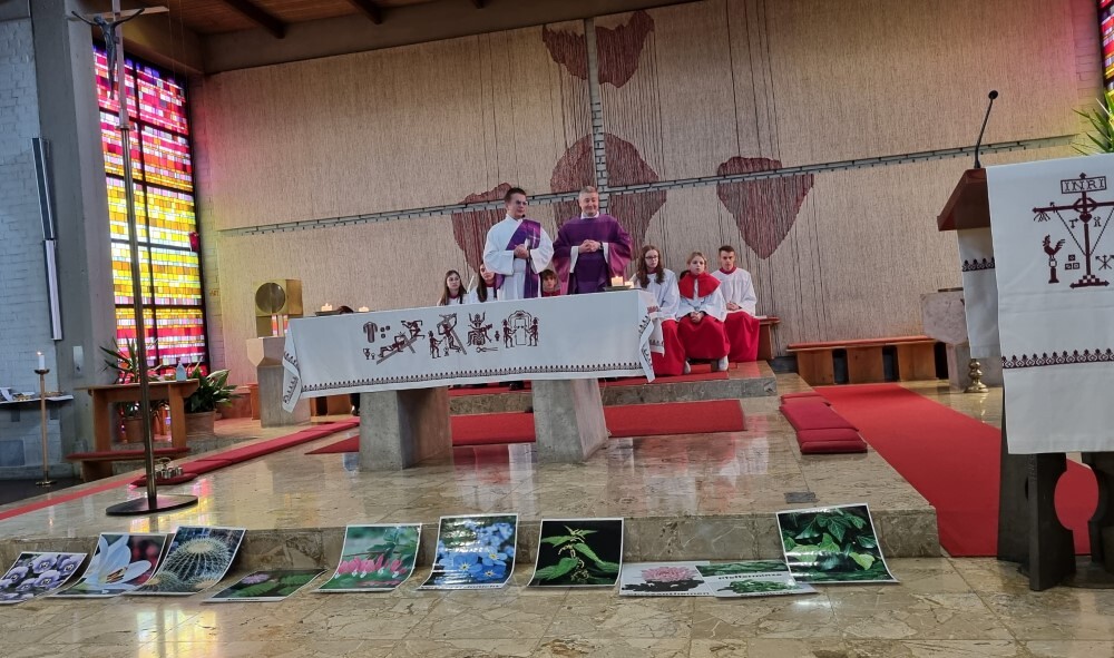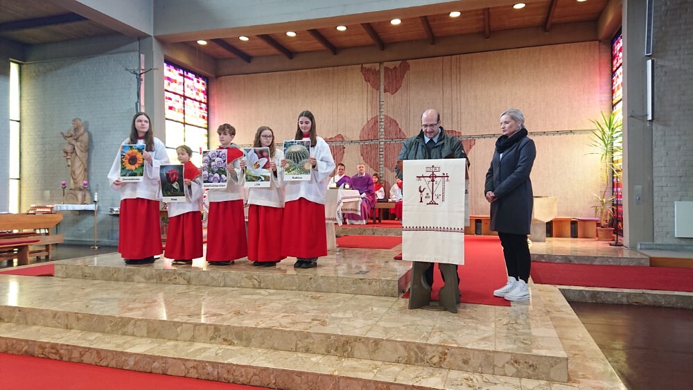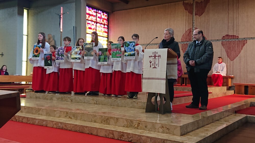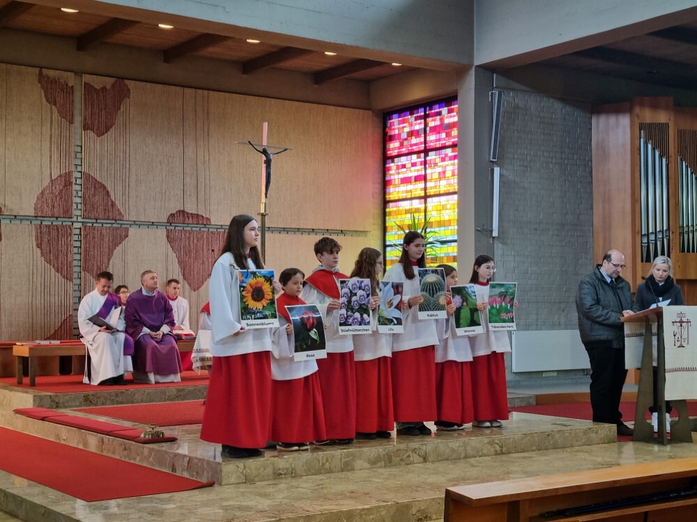 Gemeinsam mit Pfarrer Claudiu Budau und Diakon Wolfgang Garber feierten viele von ihnen den sonntäglichen Gottesdienst. Pastoralreferentin Ines und der neue Pastoralpraktikant Markus stellten mit unterschiedlichen Blumenbildern und der Beschreibung ihrer Eigenschaften auch anschaulich die Verschiedenheit der Aufgaben und Einsatzbereiche der ehrenamtlichen Mitarbeiter und Mitarbeiterinnen dar.