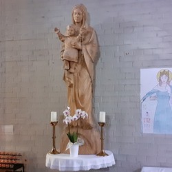 Das Bild unserer Schutzmantelmadonna mit den Bitten hängt in der Kirche bei der Marienstatue und lädt zum Entzünden einer Kerze ein.
