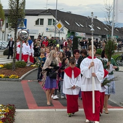 Eine Bläsergruppe der Marktmusik umrahmte die Segnung musikalisch. Danach folgten viele der Einladung zur Prozession. Die Kinder gingen mit dem großen Palmbuschen und stellten in der Kirche den Einzug, sowie die kindgerechte Passion mit einfachen Mitteln dar. Ein Ministrant trug stellvertretend für Jesus ein kleines Stück lang das schwere Kreuz, das am Ende mit einem schwarzen Tuch verhüllt wurde.