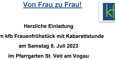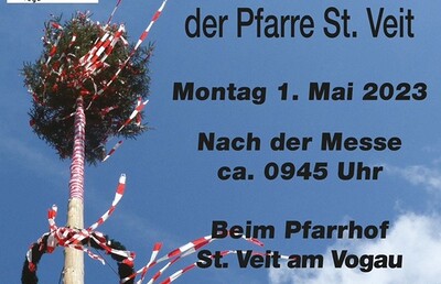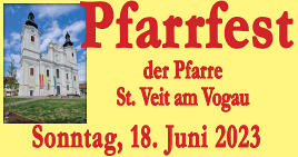 PFARRFEST St. Veit 2023 9 Uhr Festgottesdienst Festzelebrant Br. Ignaz Domej, Maria Fatima Anschließend herzliche Einladung zum Pfarrfest im Pfarrgarten. Frühschoppen mit der Erzherzog Johann Trachtenkapelle St. Veit „Traditionelle Kulinarik“ und Weinkost im „G´wölb“ Kinderprogramm Verlosung des Maibaumes und besonderer Preise Ab 14 Uhr VIERTELweis Hannes Dorner und Thomas Koller Pfarrer Robert Strohmaier, PGR, WR, kfb und die KMB freuen sich auf dein Mitfeiern! mehr: PFARRFEST St. Veit 2023