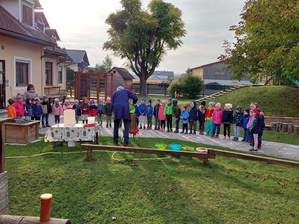 … sehen, wie Apfelsaft gepresst wird und dürfen ihn sofort trinken