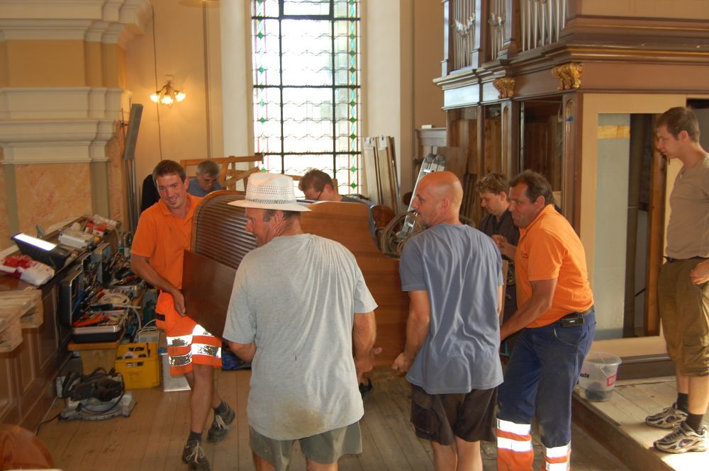 In den vergangenen zwei Monaten wurde die Orgel in alle Einzelteile zerlegt, gereinigt und die hölzernen Teile gegen Holzwurm und Schimmelpilz behandelt. Jede der über 1300 Pfeifen wurde gereinigt, wenn notwendig repariert, gefühlvoll nachintoniert und gestimmt. Die Prospektpfeifen wurden darüber hinaus neu lackiert. Alle Ventile, Kegel und Klappen wurden repariert und neu befilzt, alle Membranen wurde ausgetauscht. Die Windanlage wurde gewartet, undichte Stellen abgedichtet und der Winddruck neu eingestellt. Die veraltete Elektrik wurde komplett entfernt und durch zeitgemäße elektrische und elektronische Komponenten ersetzt.