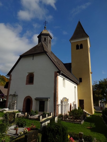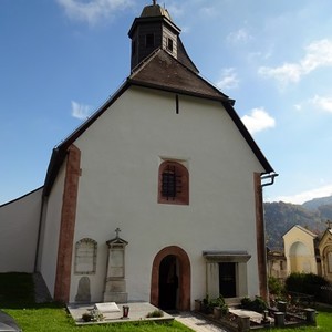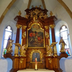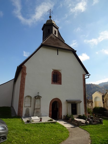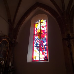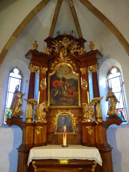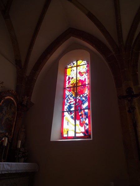 Die ursprünglich romanische Kirche zeigt heute spitzbogige gotische Fenster, ein ebenfalls gotisches Kreuzrippengewölbe im Chorraum und ein 1507 eingefügtes Sternrippengewölbe im Langhaus. Die Fenster des Altarraumes zeigen Darstellungen eines Hackenschmiedes und seiner Frau – diese hier sind Kopien aus dem Jahr 1981, die Originale aus der Zeit um 1400 finden sich im Stadtmuseum Kapfenberg.