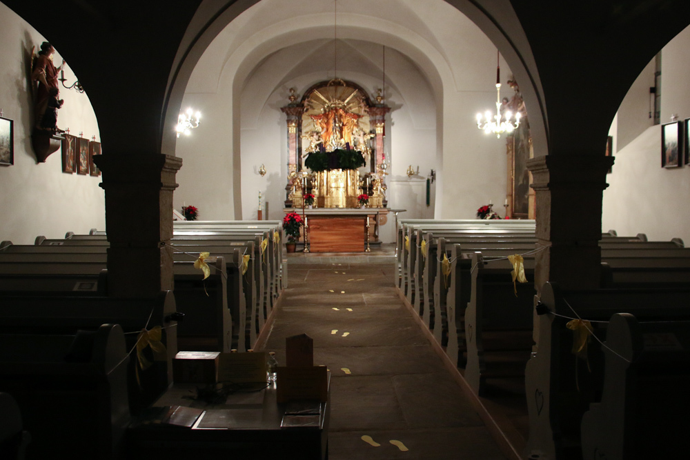 Leicht beleuchteter Innenraum der Pfarrkirche Dobl am Abend