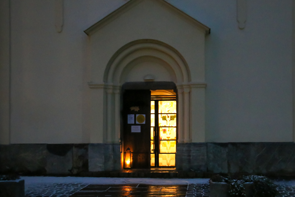 Beleuchteter Eingang der Pfarrkirche Dobl, Station zum Heiligen Nikolaus in der Pfarrkirche Tobelbad