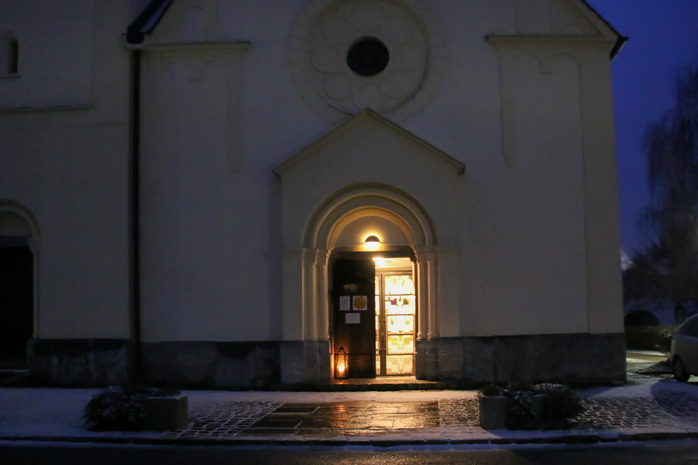 Beleuchteter Eingang der Pfarrkirche Dobl am Abend
