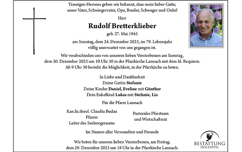 Der langjährige Mesner der Pfarre Lannach ist von uns gegangen. Wir beteten für ihn am Freitag, 29. 12. um 18:00 Uhr in der Pfarrkirche Lannach. Das Requiem fand am Samstag, 30. 12. um 10:30 Uhr statt.